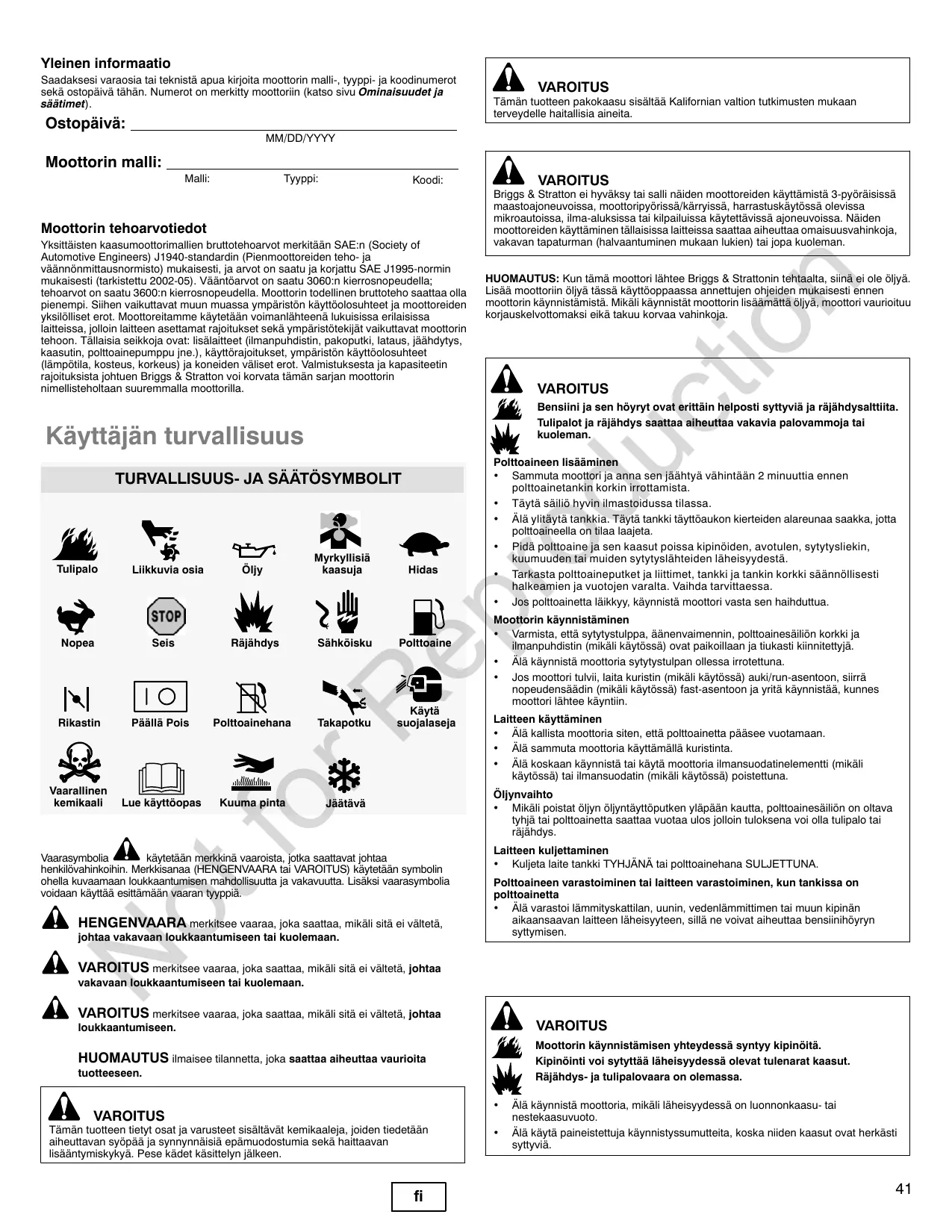 Moottorin malli: Tyyppi: VAROITUS Koodi: Yksittäisten kaasumoottorimallien bruttotehoarvot merkitään SAE:n (Society of Automotive Engineers) J1940-standardin (Pienmoottoreiden teho- ja väännönmittausnormisto) mukaisesti, ja arvot on saatu ja korjattu SAE J1995-normin mukaisesti (tarkistettu 2002-05). Vääntöarvot on saatu 3060:n kierrosnopeudella; tehoarvot on saatu 3600:n kierrosnopeudella. Moottorin todellinen bruttoteho saattaa olla pienempi. Siihen vaikuttavat muun muassa ympäristön käyttöolosuhteet ja moottoreiden yksilölliset erot. Moottoreitamme käytetään voimanlähteenä lukuisissa erilaisissa laitteissa, jolloin laitteen asettamat rajoitukset sekä ympäristötekijät vaikuttavat moottorin tehoon. Tällaisia seikkoja ovat: lisälaitteet (ilmanpuhdistin, pakoputki, lataus, jäähdytys, kaasutin, polttoainepumppu jne.), käyttörajoitukset, ympäristön käyttöolosuhteet (lämpötila, kosteus, korkeus) ja koneiden väliset erot. Valmistuksesta ja kapasiteetin rajoituksista johtuen Briggs & Stratton voi korvata tämän sarjan moottorin nimellisteholtaan suuremmalla moottorilla. HUOMAUTUS: Kun tämä moottori lähtee Briggs & Strattonin tehtaalta, siinä ei ole öljyä. Lisää moottoriin öljyä tässä käyttöoppaassa annettujen ohjeiden mukaisesti ennen moottorin käynnistämistä. Mikäli käynnistät moottorin lisäämättä öljyä, moottori vaurioituu korjauskelvottomaksi eikä takuu korvaa vahinkoja.