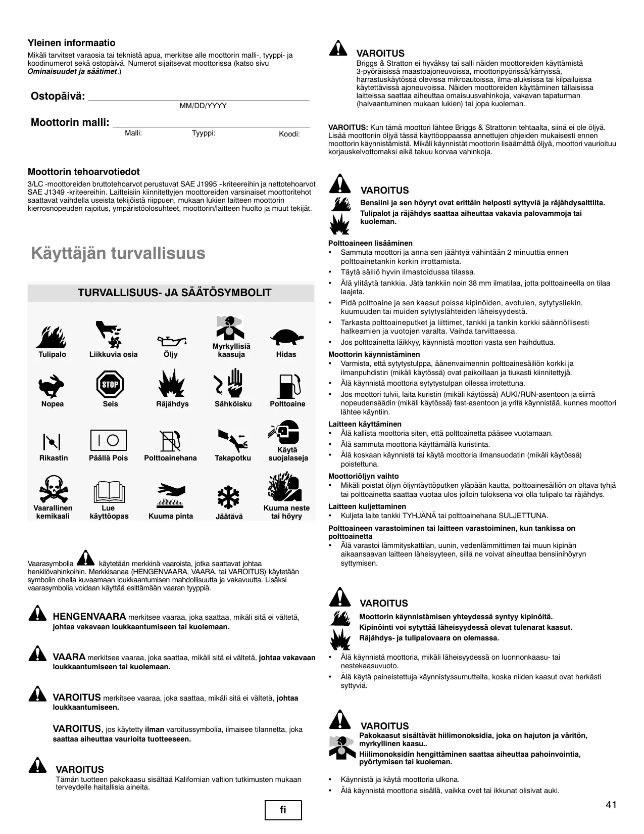 Älä käynnistä moottoria, mikäli läheisyydessä on luonnonkaasu- tai nestekaasuvuoto. Älä käytä paineistettuja käynnistyssumutteita, koska niiden kaasut ovat herkästi syttyviä. VAROITUS merkitsee vaaraa, joka saattaa, mikäli sitä ei vältetä, johtaa loukkaantumiseen. VAROITUS VAROITUS, jos käytetty ilman varoitussymbolia, ilmaisee tilannetta, joka saattaa aiheuttaa vaurioita tuotteeseen. Pakokaasut sisältävät hiilimonoksidia, joka on hajuton ja väritön, myrkyllinen kaasu.. Hiilimonoksidin hengittäminen saattaa aiheuttaa pahoinvointia, pyörtymisen tai kuoleman. VAROITUS Tämän tuotteen pakokaasu sisältää Kalifornian valtion tutkimusten mukaan terveydelle haitallisia aineita.