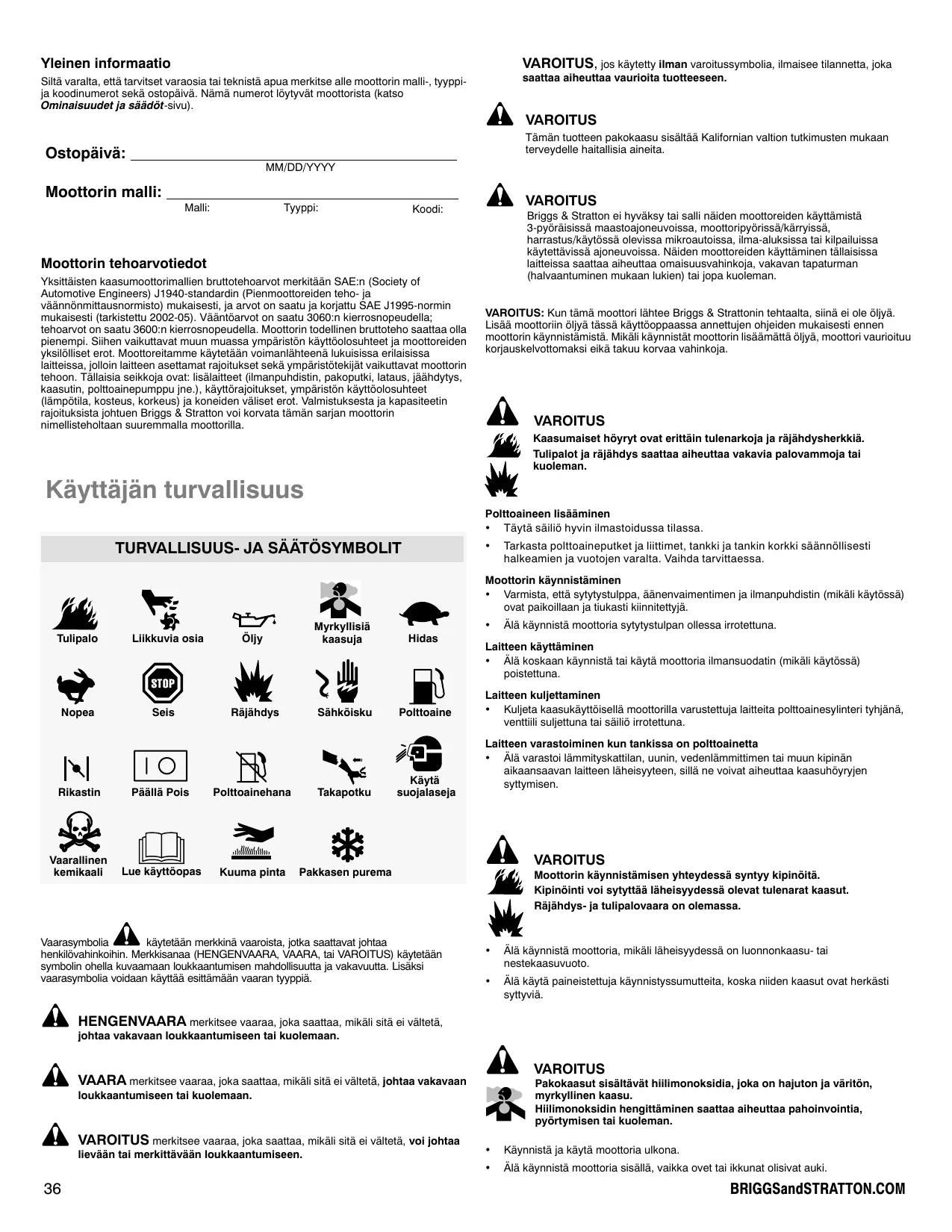 Moottorin malli: Malli: Tyyppi: VAROITUS Koodi: Briggs & Stratton ei hyväksy tai salli näiden moottoreiden käyttämistä 3-pyöräisissä maastoajoneuvoissa, moottoripyörissä/kärryissä, harrastus/käytössä olevissa mikroautoissa, ilma-aluksissa tai kilpailuissa käytettävissä ajoneuvoissa. Näiden moottoreiden käyttäminen tällaisissa laitteissa saattaa aiheuttaa omaisuusvahinkoja, vakavan tapaturman (halvaantuminen mukaan lukien) tai jopa kuoleman. Moottorin tehoarvotiedot Yksittäisten kaasumoottorimallien bruttotehoarvot merkitään SAE:n (Society of Automotive Engineers) J1940-standardin (Pienmoottoreiden teho- ja väännönmittausnormisto) mukaisesti, ja arvot on saatu ja korjattu SAE J1995-normin mukaisesti (tarkistettu 2002-05). Vääntöarvot on saatu 3060:n kierrosnopeudella; tehoarvot on saatu 3600:n kierrosnopeudella. Moottorin todellinen bruttoteho saattaa olla pienempi. Siihen vaikuttavat muun muassa ympäristön käyttöolosuhteet ja moottoreiden yksilölliset erot. Moottoreitamme käytetään voimanlähteenä lukuisissa erilaisissa laitteissa, jolloin laitteen asettamat rajoitukset sekä ympäristötekijät vaikuttavat moottorin tehoon. Tällaisia seikkoja ovat: lisälaitteet (ilmanpuhdistin, pakoputki, lataus, jäähdytys, kaasutin, polttoainepumppu jne.), käyttörajoitukset, ympäristön käyttöolosuhteet (lämpötila, kosteus, korkeus) ja koneiden väliset erot. Valmistuksesta ja kapasiteetin rajoituksista johtuen Briggs & Stratton voi korvata tämän sarjan moottorin nimellisteholtaan suuremmalla moottorilla. VAROITUS: Kun tämä moottori lähtee Briggs & Strattonin tehtaalta, siinä ei ole öljyä. Lisää moottoriin öljyä tässä käyttöoppaassa annettujen ohjeiden mukaisesti ennen moottorin käynnistämistä. Mikäli käynnistät moottorin lisäämättä öljyä, moottori vaurioituu korjauskelvottomaksi eikä takuu korvaa vahinkoja. VAROITUS Kaasumaiset höyryt ovat erittäin tulenarkoja ja räjähdysherkkiä. Tulipalot ja räjähdys saattaa aiheuttaa vakavia palovammoja tai kuoleman. Käyttäjän turvallisuus Polttoaineen lisääminen