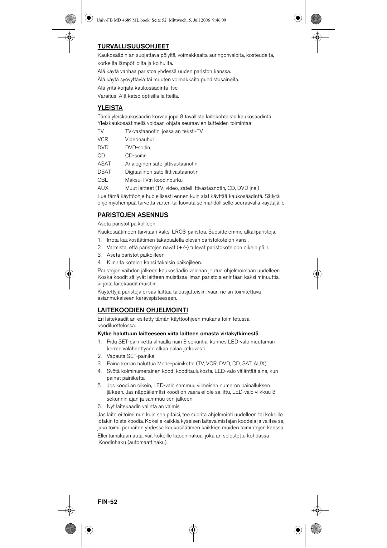 Téléchargez la notice de votre Yleiskaukosäädin au format PDF gratuitement ! Retrouvez votre notice UNIVERSAL REMOTE CONTROL ND 4689 - MEDION et reprennez votre appareil électronique en main. Sur cette page sont publiés tous les documents nécessaires à l'utilisation de votre appareil UNIVERSAL REMOTE CONTROL ND 4689 de la marque MEDION.