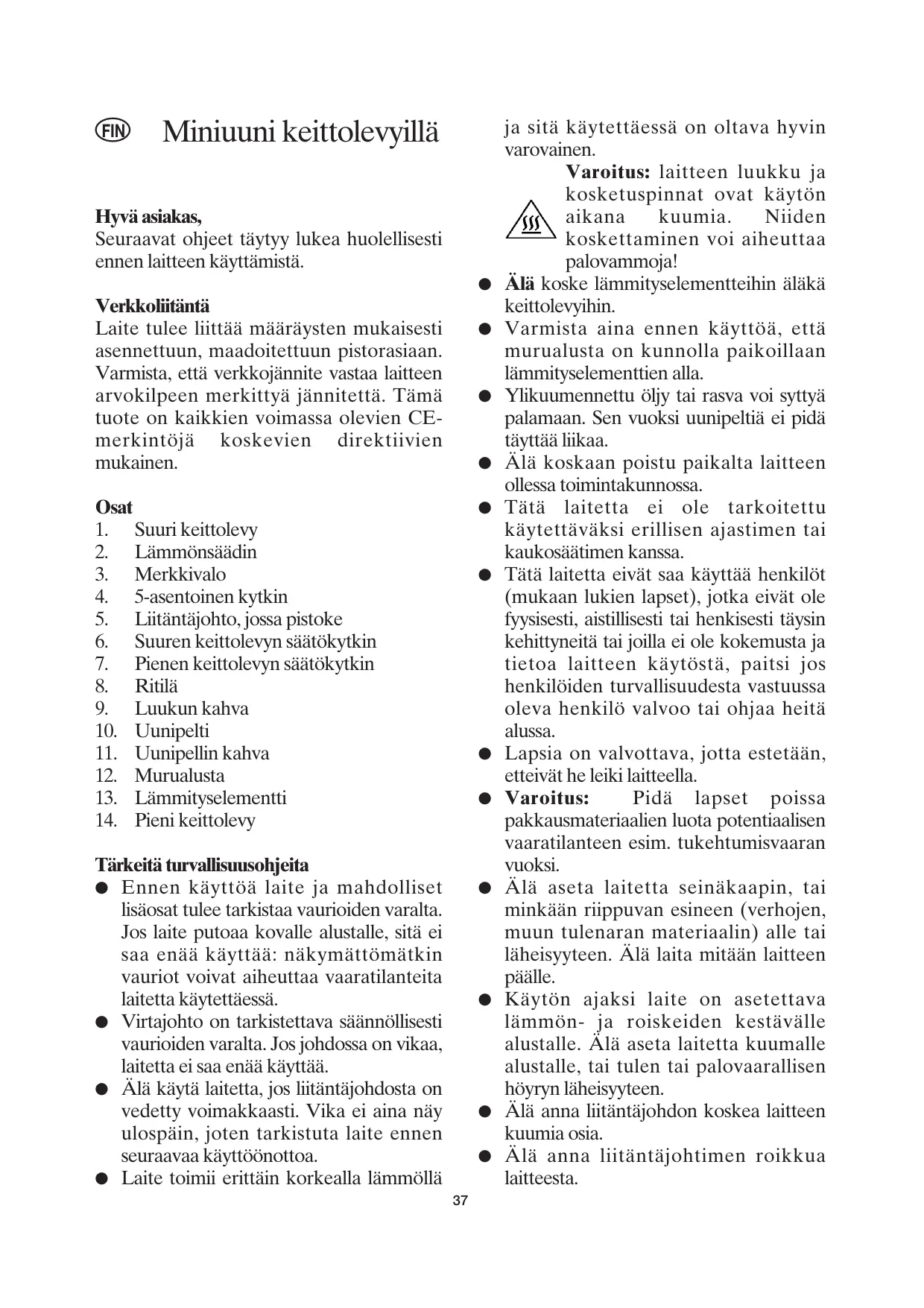 Varoitus: laitteen luukku ja kosketuspinnat ovat käytön aikana kuumia. Niiden koskettaminen voi aiheuttaa palovammoja!