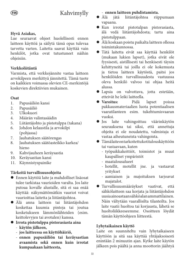 () Kahvimylly Hyvä Asiakas, Lue seuraavat ohjeet huolellisesti ennen laitteen käyttôà ja säilytä tämä opas tulevaa tarvetta varten. Laitetta saavat Käyttää vain henkilôt,_jotka ovat tutustuneet näihin ohjeisiin. Verkkoliitäntä Varmista, että verkkojännite vastaa laitteen arvokilpeen merkittyä jännitettä. Tämä tuote on kaikkien voimassa olevien CE-merkintôjà koskevien direktivien mukainen. Osat