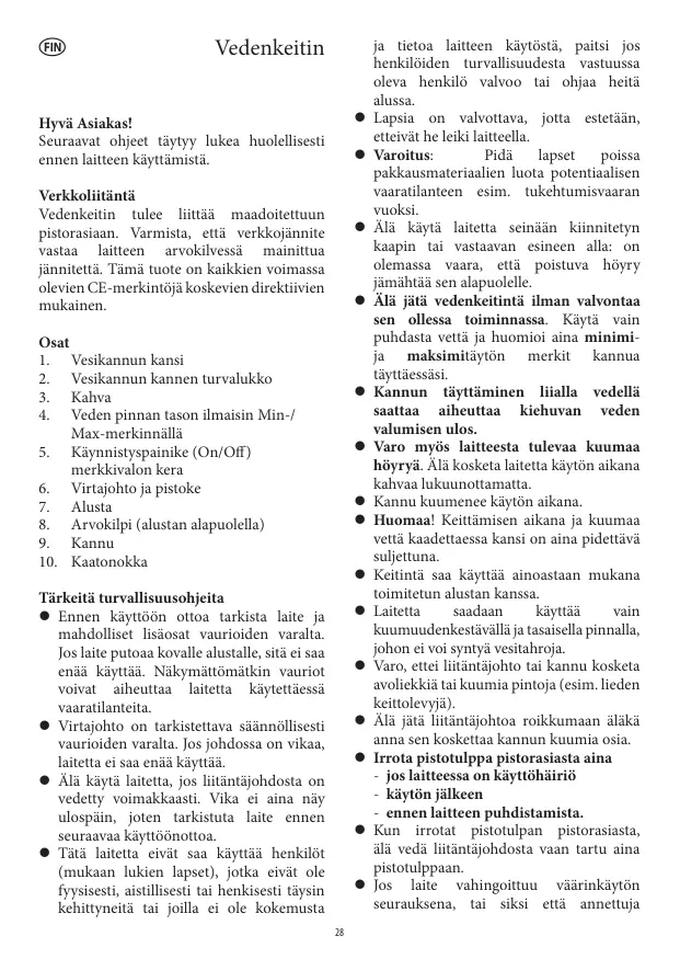 - Alä jatā vedenkeitintā ilman valvontaa sen ollessa toiminna. Kayta vain puhdata vetta ja huomioi aina minimija maksimitayton merkit kannua tāyttaessä.