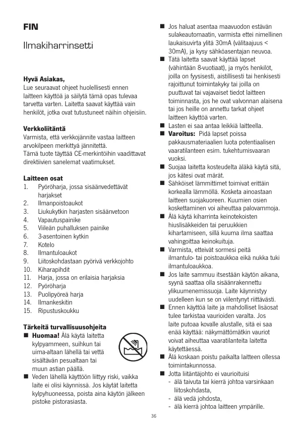 kypyammeen, suihkun tai uima-altaan lähellà tai vettä sisältävän pesualtaan tai muun astian péâll. M Veden lähellà käyitôôn lit risk, vaïkla lait ei olisi käynnissä. Jos käytät laitetta kylpyhuoneessa, poista aina kaytôn jälkeen pistoke pistorasiasta. Jos haluat asentaa maavuodon estävan sulakeautomaatin, varmista ettei nimellinen laukaïsuvirta yità 30mA (välitaajuus < 30mA), ja kysy sähkéasentajan neuvoa. Tatà laetta saavat käyttäà lapset {hintéän 8vuotiaaÿ, ja myôs henkilôt, joila on fyysisest, aistilisesti tai henkisesti rajoïtunut toimintakyky ti joila on puuftuvat tai vajavaiset tiedot latteen toiminnasta, jos he ovat valvonnan alaisena tai jos heïlle on annettu tarkat ohjeet laitteen käyitôà varten. Lasten ei saa antaa leikkiä latteella Varoitus: Pidà lapset poissa pakkausmateriaalien Iuota potentiaalisen vaaratilanteen esim. tukehtumisvaaran vuoksi. Suojaa laitetta kosteudelta äläkä käytä sitä, jos kätesi ovat mârât. Sähkôiset lämmitimet toimivat erittäin korkealla lmmëllä. Kosketa ainoastaan laïtteen suojakuoreen. Kuurien osien Koskettaminen voi aiheuttaa palovammoja Alà käytà Kiharrinta keinotekoisten hiuslisäkkeiden tai peruukkien Kihartamiseen, sillà kuura ilma saattaa vahingoittaa keinokuituja. Varmista, etteivät sormesi peità ilmantulo- tai poistoaukkoa eikà nukka tuki ilmantuloaukkoa Jos laïte sammuu itsestään käylôn aikana, Syynä saattaa olla sisäanrakennettu Yikuumenemissuoja. Laite käynnistyy uudelleen kun se on vilentynyt rittäväst Ennen kayttôà late ja mahdoliset lisäosat tuiee tarkistaa vaurioiden varalta. Jos laite putoaa kovalle alustalle, sità ei saa enâà käyttää: näkymättômätkin vauriot voivat aiheuttaa vaaratilanteita laitetta kyiettaessä, Alà koskaan poistu paikalta laïtteen ollessa toimintakunnossa. Jotta litäntäjohto ei vaurioituisi - älà taivuta tai Kierrä johtoa varsinkaan litoskohdasta, + älà vedà johdosta, älà kierrä johtoa laïtteen ymparile.
