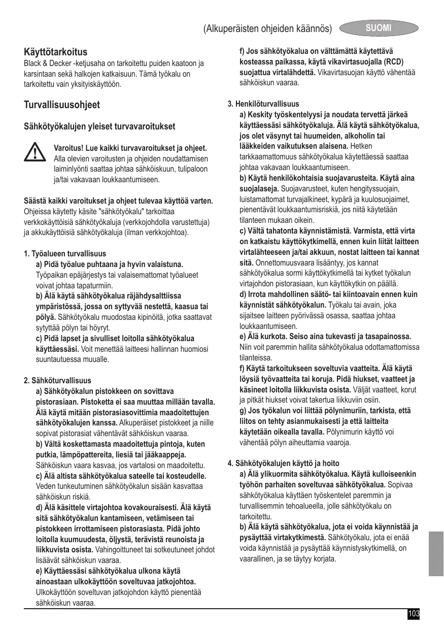 SUOMI (Alkuperäisten ohjeiden käännös) c) Irrota pistotulppa pistorasiasta ja/tai akku laitteesta ennen kuin suoritat säätöjä, vaihdat tarvikkeita tai siirrät sähkötyökalun varastoitavaksi. Nämä turvatoimenpiteet pienentävät sähkötyökalun tahattoman käynnistämisen riskiä. d) Säilytä sähkötyökalut poissa lasten ulottuvilta, kun niitä ei käytetä. Älä anna sähkötyökalua sellaisen henkilön käyttöön, joka ei tunne sitä tai joka ei ole tutustunut tähän käyttöohjeeseen. Sähkötyökalut ovat vaarallisia, jos niitä käyttävät kokemattomat henkilöt. e) Hoida sähkötyökalusi huolella. Tarkista, että liikkuvat osat toimivat moitteettomasti ja etteivät ne ole puristuksessa. Tarkista myös, ettei työkalussa ei ole murtuneita tai vahingoittuneita osia, jotka saattaisivat vaikuttaa haitallisesti sen toimintaan. Korjauta mahdolliset viat ennen käyttöönottoa. Moni tapaturma aiheutuu huonosti huolletuista laitteista. f) Pidä leikkausterät terävinä ja puhtaina. Huolellisesti hoidetut leikkausterät, joiden leikkausreunat ovat teräviä, eivät tartu helposti kiinni, ja niitä on helpompi hallita. g) Käytä sähkötyökaluja, tarvikkeita, vaihtoteriä yms. näiden ohjeiden mukaisesti. Ota tällöin huomioon työolosuhteet ja suoritettava toimenpide. Sähkötyökalun käyttö muuhun kuin sille määrättyyn käyttöön saattaa johtaa vaarallisiin tilanteisiin.