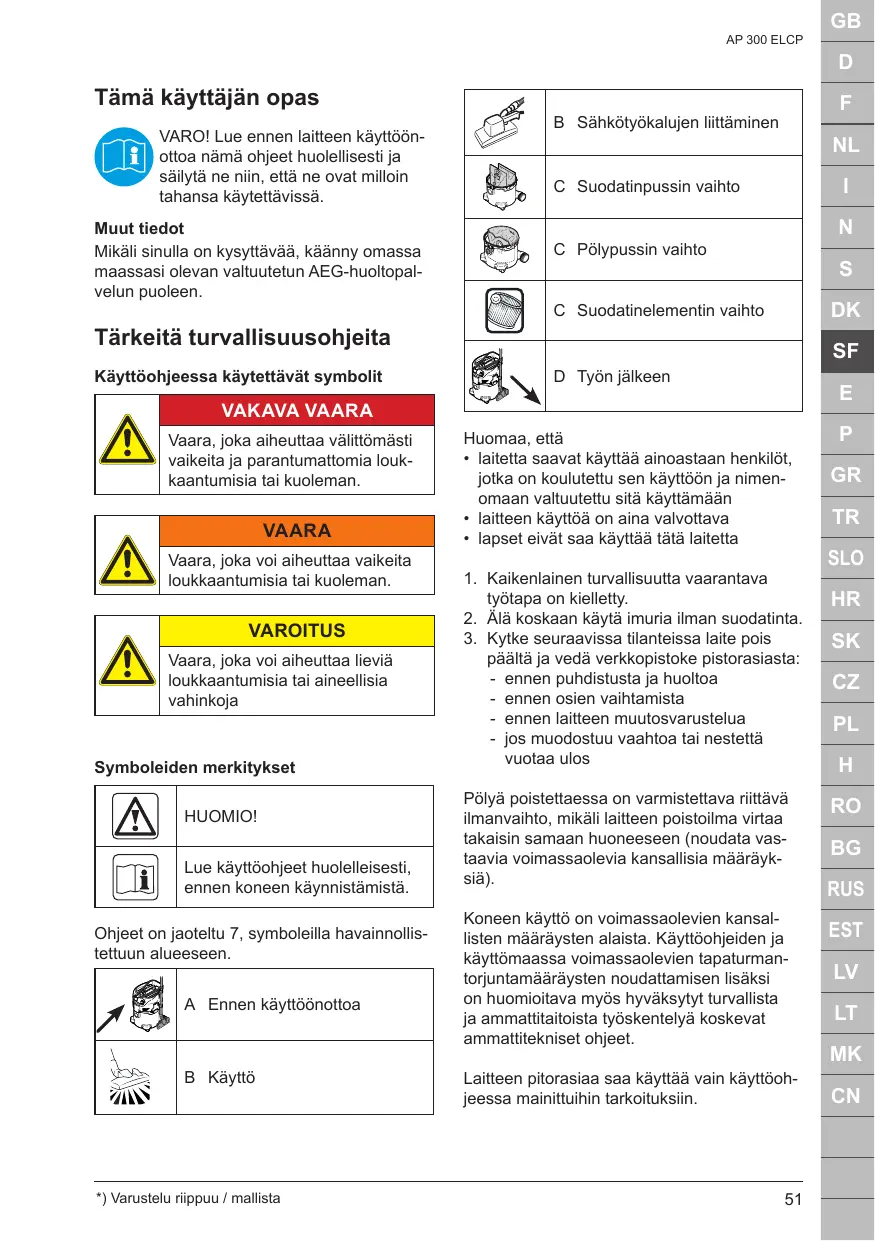 *) Særligt tilbehør / modeltyper AP 300 ELCP Tämä käyttäjän opas VARO! Lue ennen laitteen käyttöönottoa nämä ohjeet huolellisesti ja säilytä ne niin, että ne ovat milloin tahansa käytettävissä. Muut tiedot Mikäli sinulla on kysyttävää, käänny omassa maassasi olevan valtuutetun AEG-huoltopalvelun puoleen. Tärkeitä turvallisuusohjeita Käyttöohjeessa käytettävät symbolit VAARA Vaara, joka voi aiheuttaa vaikeita loukkaantumisia tai kuoleman. VAROITUS Vaara, joka voi aiheuttaa lieviä loukkaantumisia tai aineellisia vahinkoja Symboleiden merkitykset HUOMIO! Lue käyttöohjeet huolelleisesti, ennen koneen käynnistämistä. Ohjeet on jaoteltu 7, symboleilla havainnollistettuun alueeseen. A Ennen käyttöönottoa B Käyttö *) Varustelu riippuu / mallista
