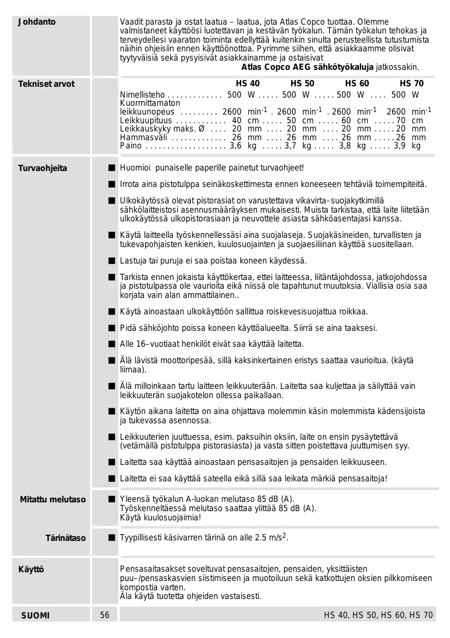| Johdanto | Vaatit parasta ja ostat laatua – laatua, jota Atlas Copco tuottaa. Olemme valmistaneet käytöösi luotettavan jakestävän työkalun. Tämän työkalun tehokas ja terveydellesi vaaraton toiminta edellyttää kuitenkin sinuhta perusteellsta tutustumista näihin ohjeisinnen käytöönottoa. Pyrimme sihen,että asiakkaamme olisivat tytyväisia sékä pysisivät asiakkainamme ja ostaisivat Atlas Copco AEG sähkötyökaluja jatkossakin. |