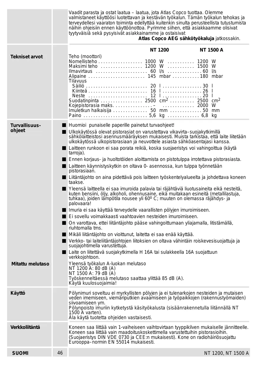 - NT 1200, NT 1500 A Vaadit parasta ja ostat laatua – laatua, jota Atlas Copco tuottaa. Olemme valmistaneet käyttöösi luotettavan ja kestävän työkalun. Tämän työkalun tehokas ja terveydellesi vaaraton toiminta edellyttää kuitenkin sinulta perusteellista tutustumista näihin ohjeisiin ennen käyttöönottoa. Pyrimme siihen, että asiakkaamme olisivat tyytyväisiä sekä pysyisivät asiakkainamme ja ostaisivat Atlas Copco AEG sähkötyökaluja jatkossakin. NT 1200 NT 1500 A Teho (moottori) Nomellisteho p. 1000
