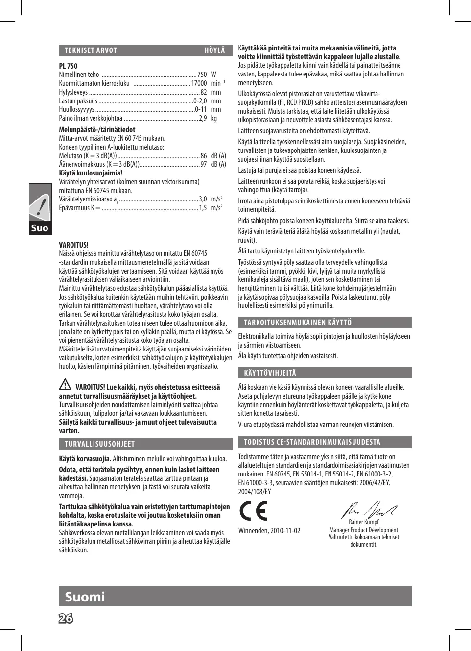 dB (A) dB (A) m/s2 m/s2 Suo Käyttäkää pinteitä tai muita mekaanisia välineitä, jotta voitte kiinnittää työstettävän kappaleen lujalle alustalle. Jos pidätte työkappaletta kiinni vain kädellä tai painatte itseänne vasten, kappaleesta tulee epävakaa, mikä saattaa johtaa hallinnan menetykseen. Ulkokäytössä olevat pistorasiat on varustettava vikavirtasuojakytkimillä (FI, RCD PRCD) sähkölaitteistosi asennusmääräyksen mukaisesti. Muista tarkistaa, että laite liitetään ulkokäytössä ulkopistorasiaan ja neuvottele asiasta sähköasentajasi kanssa. Laitteen suojavarusteita on ehdottomasti käytettävä. Käytä laitteella työskennellessäsi aina suojalaseja. Suojakäsineiden, turvallisten ja tukevapohjaisten kenkien, kuulosuojainten ja suojaesiliinan käyttöä suositellaan. Lastuja tai puruja ei saa poistaa koneen käydessä. Laitteen runkoon ei saa porata reikiä, koska suojaeristys voi vahingoittua (käytä tarroja). Irrota aina pistotulppa seinäkoskettimesta ennen koneeseen tehtäviä toimempiteitä. Pidä sähköjohto poissa koneen käyttöalueelta. Siirrä se aina taaksesi. Käytä vain teräviä teriä äläkä höylää koskaan metallin yli (naulat, ruuvit). Älä tartu käynnistetyn laitteen työskentelyalueelle. Työstössä syntyvä pöly saattaa olla terveydelle vahingollista (esimerkiksi tammi, pyökki, kivi, lyijyä tai muita myrkyllisiä kemikaaleja sisältävä maali), joten sen koskettaminen tai hengittäminen tulisi välttää. Liitä kone kohdeimujärjestelmään ja käytä sopivaa pölysuojaa kasvoilla. Poista laskeutunut pöly huolellisesti esimerkiksi pölynimurilla. VAROITUS! Näissä ohjeissa mainittu värähtelytaso on mitattu EN 60745 -standardin mukaisella mittausmenetelmällä ja sitä voidaan käyttää sähkötyökalujen vertaamiseen. Sitä voidaan käyttää myös värähtelyrasituksen väliaikaiseen arviointiin. Mainittu värähtelytaso edustaa sähkötyökalun pääasiallista käyttöä. Jos sähkötyökalua kuitenkin käytetään muihin tehtäviin, poikkeavin työkaluin tai riittämättömästi huoltaen, värähtelytaso voi olla erilainen. Se voi korottaa värähtelyrasitusta koko työajan osalta.
