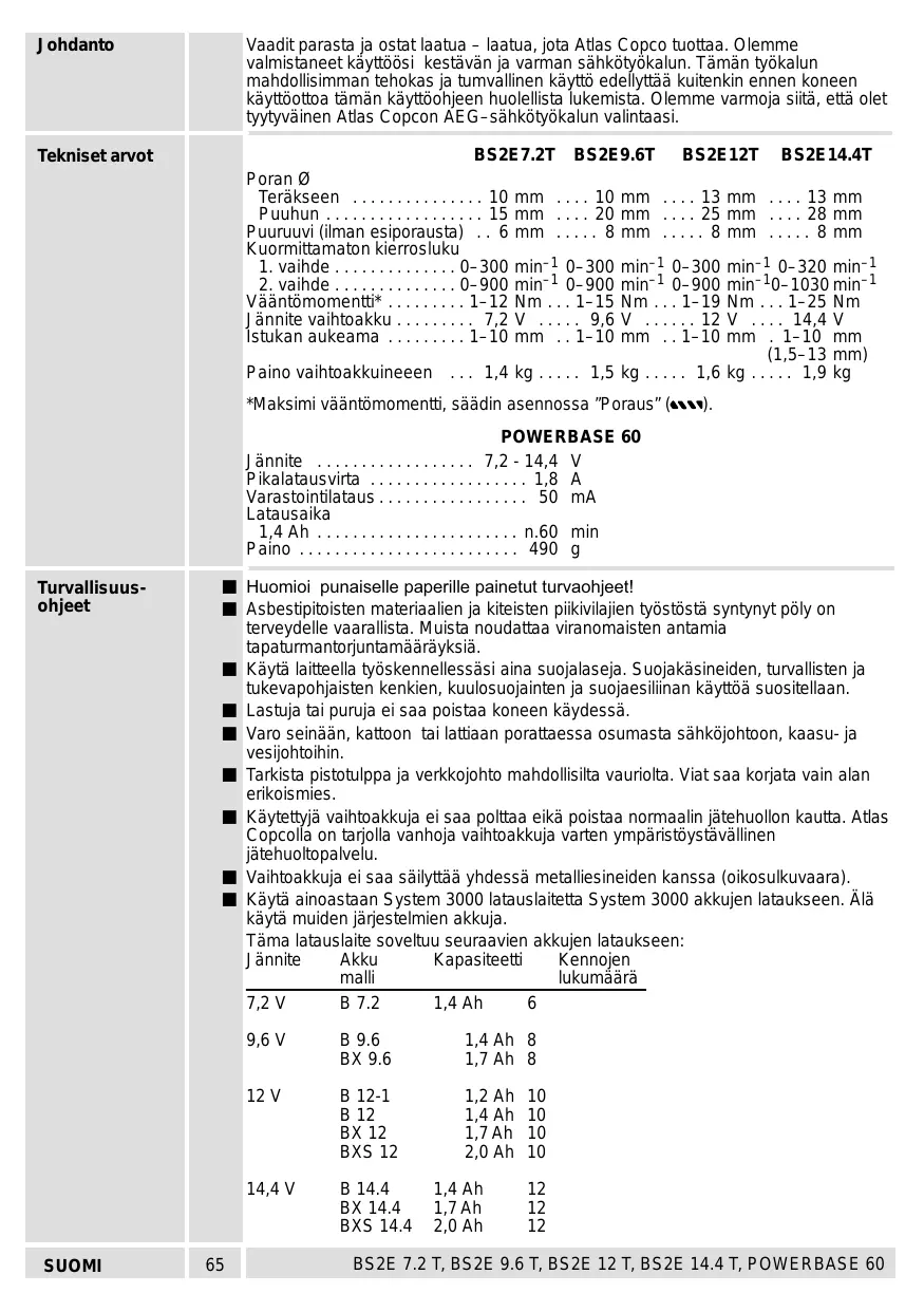 - BS2E 7.2 T, BS2E 9.6 T, BS2E 12 T, BS2E 14.4 T, POWERBASE 60 Johdanto Vaadit parasta ja ostat laatua – laatua, jota Atlas Copco tuottaa. Olemme valmistaneet käyttöösi kestävän ja varman sähkötyökalun. Tämän työkalun mahdollisimman tehokas ja tumvallinen käyttö edellyttää kuitenkin ennen koneen käyttöottoa tämän käyttöohjeen huolellista lukemista. Olemme varmoja siitä, että olet tyytyväinen Atlas Copcon AEG–sähkötyökalun valintaasi. Tekniset arvot BS2E7.2T BS2E9.6T BS2E12T BS2E14.4T Poran Ø Teräkseen p. 10