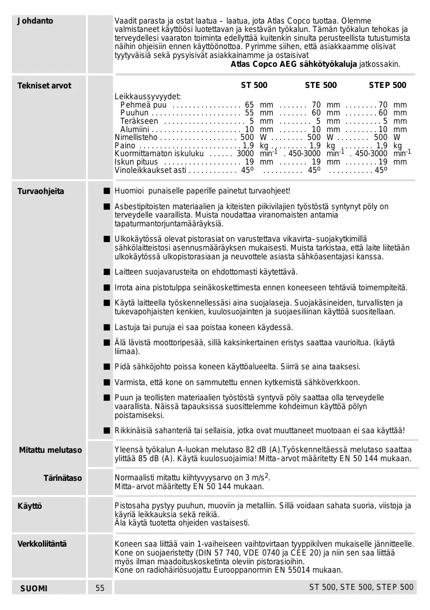 - Johdanto Vaadit parasta ja ostat laatua – laatua, jota Atlas Copco tuottaa. Olemme valmistaneet käyttöösi luotettavan ja kestävän työkalun. Tämän työkalun tehokas ja terveydellesi vaaraton toiminta edellyttää kuitenkin sinulta perusteellista tutustumista näihin ohjeisiin ennen käyttöönottoa. Pyrimme siihen, että asiakkaamme olisivat tyytyväisiä sekä pysyisivät asiakkainamme ja ostaisivat Atlas Copco AEG sähkötyökaluja jatkossakin. Tekniset arvot ST 500 STE 500 STEP 500 Leikkaussyvyydet: Pehmeä puu p. 65