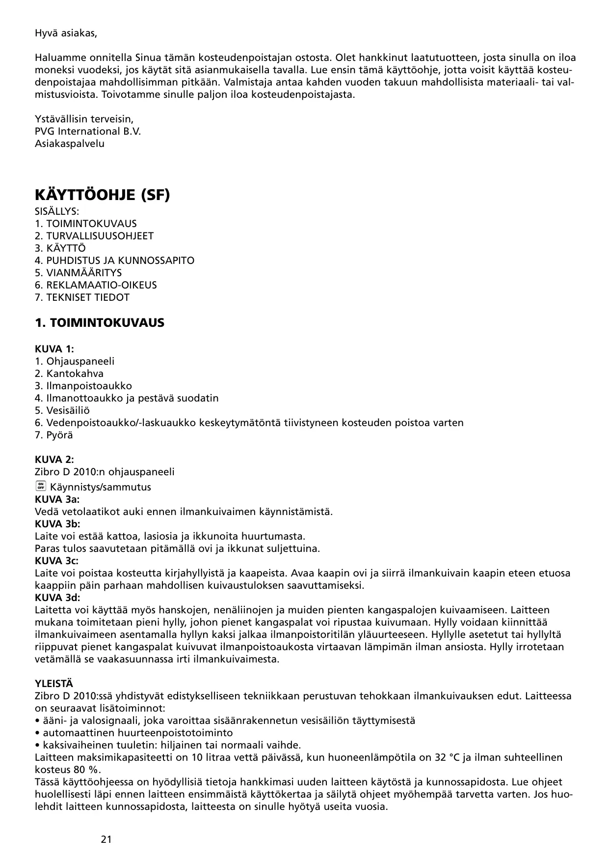 L’appareil permet d’éliminer les mauvaises odeurs des bibliothèques et des armoires. Pour une déshumidification efficace, ouvrez le meuble et placez l’appareil devant. ILLUSTRATION 3d: L’appareil peut également s’utiliser pour sécher gants, mouchoirs et autres petits vêtements. Accrochez les vêtements à sécher sur le petit étendage fourni avec l’appareil. Pour le fixer sur le déshumidificateur, placer les deux pieds de l’étendage sur la rainure située en haut de la grille de la sortie d’air. Pour sécher des vêtements de très petite taille déposés ou accrochés sur l’étendage, vous pouvez aussi utiliser la sortie d’air chaud. Pour décrocher l’étendage du déshumidificateur, appuyez sur les côtés. GÉNÉRALITÉS Zibro D 2010 assure une déshumidification très efficace grâce à une technologie avancée. L’appareil est équipé des fonctions suivantes: • Signal d’avertissement sonore et visuel lorsque le réservoir d’eau intégré est plein. • Fonction de dégel automatique. • Ventilateur à deux vitesses: silencieux ou normal. L’appareil a une capacité maximum de 10 litres d’eau par jour à une température ambiante de 32° C et à un taux d’humidité relative de 80%. Ce manuel contient des informations importantes pour l’utilisation et l’entretien de votre nouvel appareil. Lisez attentivement les instructions avant la première utilisation du déshumidificateur. Conservez le manuel pour le consulter ultérieurement. Maintenez votre appareil en bon état de fonctionnement et vous pourrez en profiter pendant de longues années.
