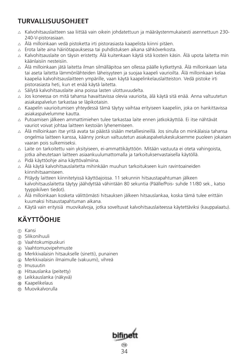 Bedienings- en veiligheidsaanwijzingen Àԉ›ÍÂȘ ¯ÂÈÚÈÛÌÔ‡ Î·È ·ÛÊ·Ï›·˜ Wskazówki dotyczàce obs∏ugi i bezpieczeƒstwa Pokyny k ovládání Débranchez toujours l'appareil en cas de défaut de fonctionnement ou pour le nettoyage. L'appareil à souder est entièrement isolé. Cependant, ne l'utilisez jamais avec des mains humides. Ne plongez jamais l'appareil dans un liquide. Ne laissez jamais l'appareil en marche sans surveillance. Ne placez jamais l'appareil à proximité de sources de chaleur et protégez le cordon de tout endommagement. N'enroulez jamais le cordon autour de l'appareil, utilisez pour cela le dispositif d'enroulement prévu à cet effet. Débranchez la prise de l'appareil dès que vous ne l'utilisez plus. Conservez toujours l'appareil hors de portée des enfants. Si l'appareil est manifestement endommagé, ne l'utilisez plus. Faites-le soumettre à un examen complet par un SAV agréé. En cas d'endommagement du cordon, celui-ci doit être remplacé par un cordon spécial, que vous pouvez vous procurer auprès de notre SAV. Si l'appareil est tombé, le faire contrôler par un spécialiste avant de le réutiliser. Même des endom magements non visibles peuvent diminuer la longévité de l'appareil. N'essayez jamais d'ouvrir vous-même l'appareil ou d'y faire entrer des objets en métal. En cas de problèmes avec l'appareil, adressez-vous à l'un de nos SAV agréés afin d'exclure tout risque. L'appareil n'est conçu que pour un usage domestique, et non pour un usage commercial. Il n'est assumé aucune garantie ni responsabilité pour tous dommages résultant d'une utilisation erronée et non adaptée de l'appareil. Tenez toujours le mode d'emploi à portée de la main. N'utilisez jamais l'appareil dans un but autre que l'emballage de produits alimentaires. Respectez les durées d'utilisation données pour l'appareil. Après une procédure de soudage de 11 secondes, l'appareil doit refroidir pendant au moins 80 secondes (rapport Marche/Arrêt 11/80 sec., voir données sur la plaque signalétique). Ne touchez jamais le fil soudeur immédiatement après le travail, car il devient brûlant pendant l'opération. Utilisez uniquement des films plastiques spéciaux pouvant être utilisés avec un appareil à souder (qualité commerciale).