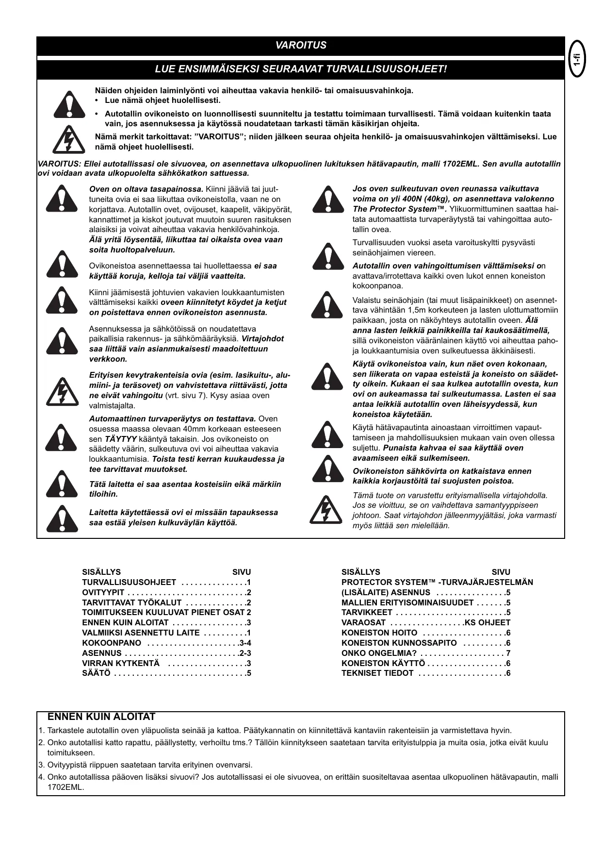 - Autotallin ovikoneisto on luonnollisesti suunniteltu ja testattu toimimaan turvallisesti. Tämä voidaan kuitenkin taata vain, jos asennuksessa ja käytössä noudatetaan tarkasti tämän käsikirjan ohjeita. Nämä merkit tarkoittavat: ”VAROITUS”; niiden jälkeen seuraa ohjeita henkilö- ja omaisuusvahinkojen välttämiseksi. Lue nämä ohjeet huolellisesti. VAROITUS: Ellei autotallissasi ole sivuovea, on asennettava ulkopuolinen lukituksen hätävapautin, malli 1702EML. Sen avulla autotallin ovi voidaan avata ulkopuolelta sähkökatkon sattuessa. Oven on oltava tasapainossa. Kiinni jääviä tai juuttuneita ovia ei saa liikuttaa ovikoneistolla, vaan ne on korjattava. Autotallin ovet, ovijouset, kaapelit, väkipyörät, kannattimet ja kiskot joutuvat muutoin suuren rasituksen alaisiksi ja voivat aiheuttaa vakavia henkilövahinkoja. Älä yritä löysentää, liikuttaa tai oikaista ovea vaan soita huoltopalveluun. Jos oven sulkeutuvan oven reunassa vaikuttava voima on yli 400N (40kg), on asennettava valokenno The Protector System™. Ylikuormittuminen saattaa haitata automaattista turvaperäytystä tai vahingoittaa autotallin ovea. Ovikoneistoa asennettaessa tai huollettaessa ei saa käyttää koruja, kelloja tai väljiä vaatteita. Autotallin oven vahingoittumisen välttämiseksi on avattava/irrotettava kaikki oven lukot ennen koneiston kokoonpanoa. Kiinni jäämisestä johtuvien vakavien loukkaantumisten välttämiseksi kaikki oveen kiinnitetyt köydet ja ketjut on poistettava ennen ovikoneiston asennusta. Asennuksessa ja sähkötöissä on noudatettava paikallisia rakennus- ja sähkömääräyksiä. Virtajohdot saa liittää vain asianmukaisesti maadoitettuun verkkoon. Erityisen kevytrakenteisia ovia (esim. lasikuitu-, alumiini- ja teräsovet) on vahvistettava riittävästi, jotta ne eivät vahingoitu (vrt. sivu 7). Kysy asiaa oven valmistajalta. Automaattinen turvaperäytys on testattava. Oven osuessa maassa olevaan 40mm korkeaan esteeseen sen TÄYTYY kääntyä takaisin. Jos ovikoneisto on säädetty väärin, sulkeutuva ovi voi aiheuttaa vakavia loukkaantumisia. Toista testi kerran kuukaudessa ja tee tarvittavat muutokset. Tätä laitetta ei saa asentaa kosteisiin eikä märkiin tiloihin. Laitetta käytettäessä ovi ei missään tapauksessa saa estää yleisen kulkuväylän käyttöä. SISÄLLYS SIVU TURVALLISUUSOHJEET . . . . . . . . . . . . . . .1 OVITYYPIT . . . . . . . . . . . . . . . . . . . . . . . . . . .2