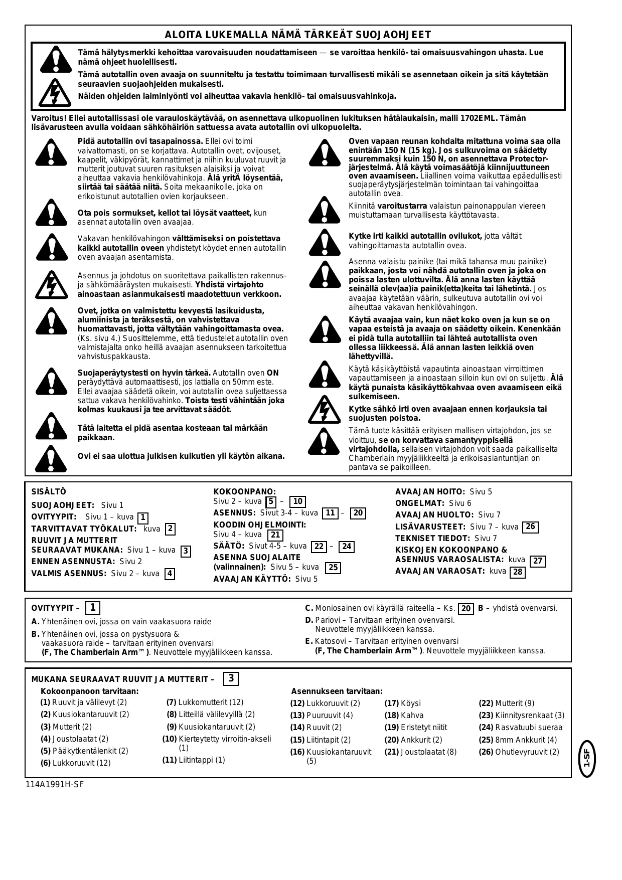 114A1991H-S ALOITA LUKEMALLA NÄMÄ TÄRKEÄT SUOJAOHJEET Tämä hälytysmerkki kehoittaa varovaisuuden noudattamiseen — se varoittaa henkilö- tai omaisuusvahingon uhasta. Lue nämä ohjeet huolellisesti. Tämä autotallin oven avaaja on suunniteltu ja testattu toimimaan turvallisesti mikäli se asennetaan oikein ja sitä käytetään seuraavien suojaohjeiden mukaisesti. Näiden ohjeiden laiminlyönti voi aiheuttaa vakavia henkilö- tai omaisuusvahinkoja. Varoitus! Ellei autotallissasi ole varauloskäytävää, on asennettava ulkopuolinen lukituksen hätälaukaisin, malli 1702EML. Tämän lisävarusteen avulla voidaan sähköhäiriön sattuessa avata autotallin ovi ulkopuolelta.