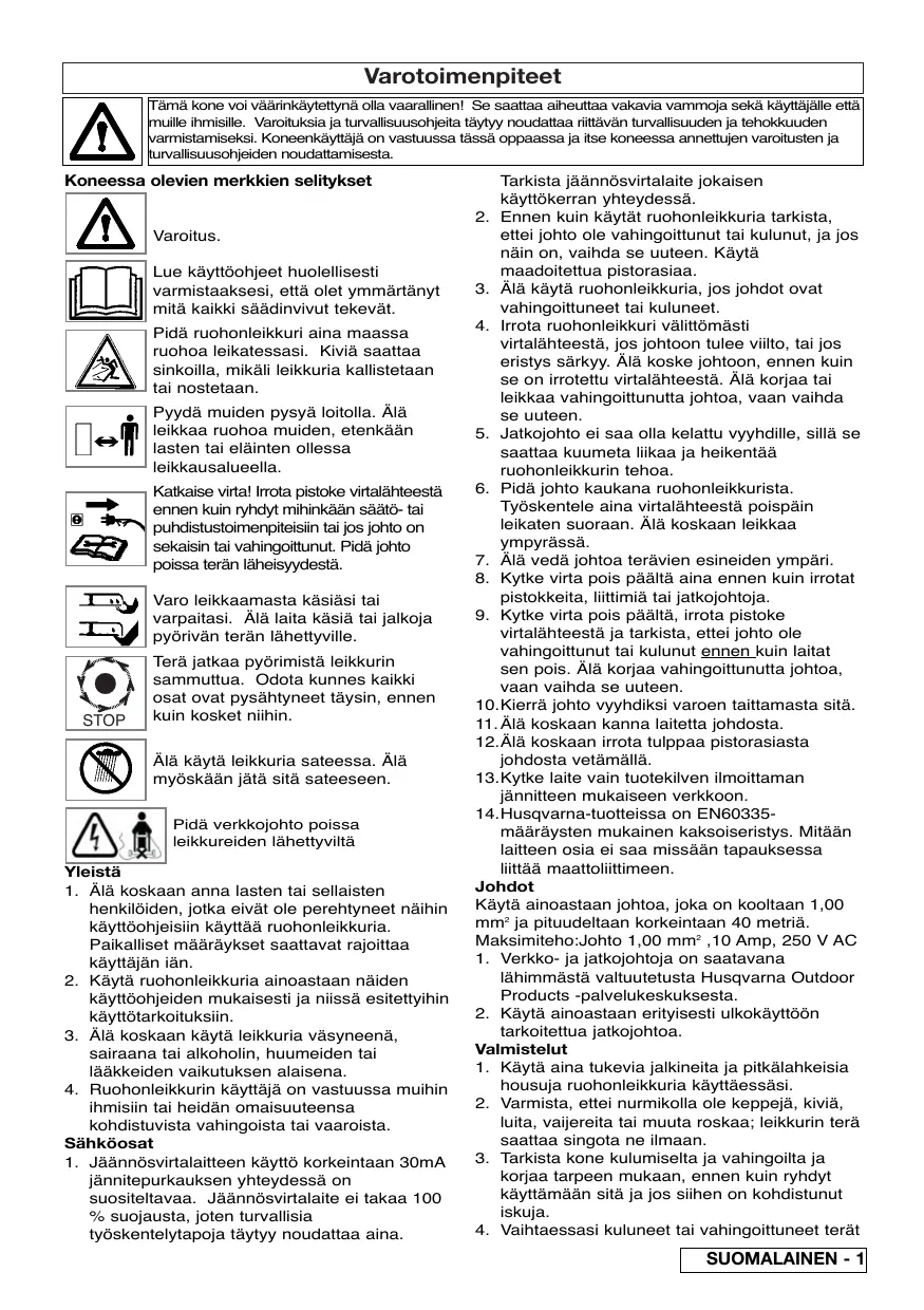 - Advarsel! Husqvarna Outdoor Products påtar seg intet ansvar under garantien for feil som helt eller delvis, direkte eller indirekte, har oppstått som følge av at nye deler eller ekstra deler er montert, som ikke er fabrikert eller godkjent av Husqvarna Outdoor Products, eller som følge av at maskinen på noen måte har vært modifisert. Varotoimenpiteet Tämä kone voi väärinkäytettynä olla vaarallinen! Se saattaa aiheuttaa vakavia vammoja sekä käyttäjälle että muille ihmisille. Varoituksia ja turvallisuusohjeita täytyy noudattaa riittävän turvallisuuden ja tehokkuuden varmistamiseksi. Koneenkäyttäjä on vastuussa tässä oppaassa ja itse koneessa annettujen varoitusten ja turvallisuusohjeiden noudattamisesta. Koneessa olevien merkkien selitykset Varoitus. Lue käyttöohjeet huolellisesti varmistaaksesi, että olet ymmärtänyt mitä kaikki säädinvivut tekevät. Pidä ruohonleikkuri aina maassa ruohoa leikatessasi. Kiviä saattaa sinkoilla, mikäli leikkuria kallistetaan tai nostetaan. Pyydä muiden pysyä loitolla. Älä leikkaa ruohoa muiden, etenkään lasten tai eläinten ollessa leikkausalueella. Katkaise virta! Irrota pistoke virtalähteestä ennen kuin ryhdyt mihinkään säätö- tai puhdistustoimenpiteisiin tai jos johto on sekaisin tai vahingoittunut. Pidä johto poissa terän läheisyydestä. Varo leikkaamasta käsiäsi tai varpaitasi. Älä laita käsiä tai jalkoja pyörivän terän lähettyville. STOP Terä jatkaa pyörimistä leikkurin sammuttua. Odota kunnes kaikki osat ovat pysähtyneet täysin, ennen kuin kosket niihin. Älä käytä leikkuria sateessa. Älä myöskään jätä sitä sateeseen. Pidä verkkojohto poissa leikkureiden lähettyviltä Yleistä
