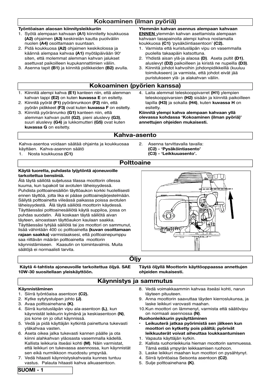 (C2) - ‘Pysäkôintiasento’ (C3) - ‘Leikkuuasento’. Polttoaine Käytä tuoretta, puhdasta lyijytôntä ajoneuvoille tarkoitettua bensiniä. Âlà täytä säiiôtà suletussa tilassa moottorin ollessa kuuma, kun tupakoit tai avotulen läheisyydessä. Puhdista polttoainesäiliôn täyttéaukon korkki huolelisesti ennen täyttôà, jotta lika ei pâäse polttoainejänestelmään Säiytà polttoainetta villeässä paikassa poissa avotulen läheisyydestä. Àlà täytà säiliôtà moottorin käydessä. Täyttessäsi polttoainesäiliôtäà käytä suppiloa, jossa on puhdas suodatin. Àlà koskaan täytà säiliôtà aivan täyteen, ainoastaan täyttéaukon kaulaan saakka. Täyttäessäsi tyhjäà säiliôtà tai jos moottori on sammunut, lisää vähintään 400 cc polttoainetta (kuvan osoittamaan rajaan saakka) varmistaaksesi, ettäà polttoainepumppu saa rittävän määrän polttoainetta_ moottorin käynnistämiseen. Kaasutin on toimintavalmis. Muita säätôjà ei normaalisti tarvita. [ Oliy Käytä 4-tahtista ajoneuvoille tarkoitettua ôljyä. SAE 10W-30 suositellaan yleiskäyttôôn. Täytä ôljyllä Moottorin käyttéoppaassa annettujen ohjeiden mukaisesti. [ Käynnistys ja sammutus Käynnistäminen Siirrä tyéntéaisa asentoon (C2). Kytke sytytystulpan johto (J) Avaa poittoainehana (K). Siirrä kuristusläpän vipu ala-asentoon (L), kun käynnistät leikkurin kyimänä ja keskiasentoon (N), ios kone on jo ollut käynnissä.