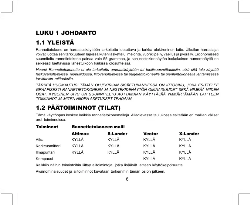 Tämä käyttöopas koskee kaikkia rannetietokonemalleja. Allaolevassa taulukossa esitetään eri mallien väliset erot toiminnoissa. Toiminnot Rannetietokoneen malli Altimax S-Lander Vector X-Lander Aika KYLLÄ KYLLÄ KYLLÄ KYLLÄ Korkeusmittari KYLLÄ KYLLÄ KYLLÄ KYLLÄ Ilmapuntari KYLLÄ KYLLÄ KYLLÄ KYLLÄ Kompassi