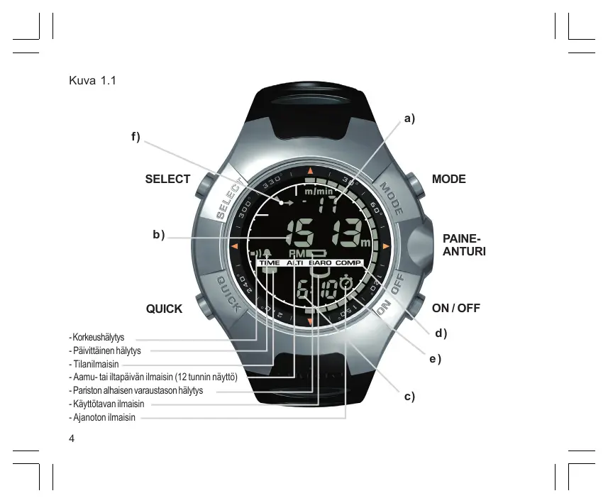 PAINEANTURI ON / OFF QUICK - Korkeushälytys - Päivittäinen hälytys - Tilanilmaisin - Aamu- tai iltapäivän ilmaisin (12 tunnin näyttö) - Pariston alhaisen varaustason hälytys - Käyttötavan ilmaisin - Ajanoton ilmaisin