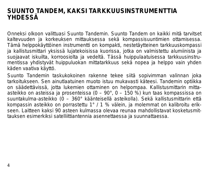 YHDESSÄ Onneksi olkoon valittuasi Suunto Tandemin. Suunto Tandem on kaikki mitä tarvitset kaltevuuden ja korkeuksen mittauksessa sekä kompassisuuntimien ottamisessa. Tämä helppokäyttöinen instrumentti on kompakti, nestetäytteinen tarkkuuskompassi ja kallistusmittari yksissä lujatekoisissa kuorissa, jotka on valmistettu alumiinista ja suojaavat iskuilta, korroosiolta ja vedeltä. Tässä huippulaatuisessa tarkkuusinstrumentissa yhdistyvät huippuluokan mittatarkkuus sekä nopea ja helppo vain yhden käden vaativa käyttö. Suunto Tandemin taskukokoinen rakenne tekee siitä sopivimman valinnan joka tarkoitukseen. Sen ainutlaatuinen muoto istuu mukavasti käteesi. Tandemin optiikka on säädettävissä, jotta lukemien ottaminen on helpompaa. Kallistusmittarin mittaasteikko on asteissa ja prosenteissa (0 – 90°, 0 – 150 %) kun taas kompassissa on suuntakulma-asteikko (0 – 360° käänteisellä asteikolla). Sekä kallistusmittarin että kompassin asteikko on porrastettu 1° / 1 % välein, ja molemmat on kalibroitu erikseen. Laitteen kaksi 90 asteen kulmassa olevaa reunaa mahdollistavat kosketusmittauksen esimerkiksi satelliittiantennia asennettaessa ja suunnattaessa.