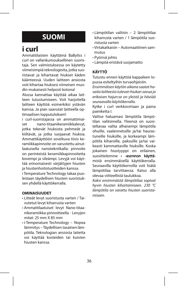 - Lämpöä eristävä suojamatto SUOMI i curl Ammattilaisten käyttämä BaByliss i curl on vallankumouksellinen suoristaja. Sen valmistuksessa on käytetty viimeisimpiä teknologioita, jotka suoristavat ja kihartavat hiukset käden käänteessä. Uuden laitteen ansiosta voit kihartaa hiuksesi viimeisen muodin mukaisesti helposti kotona! Alussa kannattaa käyttää aikaa laitteen tutustumiseen. Voit harjoitella laitteen käyttöä esimerkiksi ystävän kanssa. Ja pian saavutat laitteella optimaalisen lopputuloksen! i curl-suoristajassa on ammattimaiset nano-titaanikeramiikkalevyt, jotka tekevät hiuksista pehmeät ja kiiltävät, ja jotka suojaavat hiuksia. Ammattikäyttöön soveltuva tiivis keramiikkapinnoite on varustettu ainutlaatuisella nanotekniikalla: pinnoite on perinteistä keramiikkapinnoitetta kovempi ja sileämpi. Levyjä voi käyttää erinomaisesti värjättyjen hiusten ja hiustenhoitotuotteiden kanssa. i Temperature Technology takaa puolestaan täydellisen hiusten suoristuksen yhdellä käyttökerralla. KÄYTTÖ Tutustu ennen käyttöä kappaleen lopussa esiteltyihin turvaohjeisiin. Ensimmäisen käytön aikana saatat havaita laitteesta tulevan hiukan savua ja erikoisen hajun:se on yleistä ja häviää seuraavalla käyttökerralla. Kytke i curl verkkovirtaan ja paina painiketta I. Valitse haluamasi lämpötila lämpötilan valitsimella. Yleensä on suositeltavaa valita alhaisempi lämpötila ohuille, vaalennetuille ja/tai haurastuneille hiuksille, ja korkeampi lämpötila kiharoille, paksuille ja/tai vaikeasti kammattaville hiuksille. Koska jokainen hiustyyppi on erilainen, suosittelemme • -asennon käyttämistä ensimmäisellä käyttökerralla. Seuraavilla käyttökerroilla voit lisätä lämpötilaa tarvittaessa. Katso alla olevaa viitteellistä taulukkoa. Kaksi ensimmäistä lämpötilaa sopivat hyvin hiusten kihartamiseen. 230 °C lämpötila on varattu hiusten suoristamiseen. OMINAISUUDET