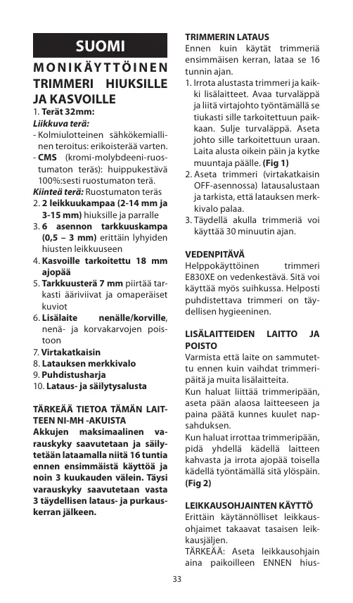 E830XE est waterproof. Elle s’utilise même sous la douche et son entretien facile vous garantit une hygiène maximale. PLACEMENT ET RETRAIT DES ACCESSOIRES Assurez-vous que l’appareil est éteint avant de changer les têtes tondeuse et d’accessoires. Pour placer une tête, ajuster le bas de l’accessoire sur l’appareil et emboîter toute la tête jusqu’au clic. Pour retirer une tête, tenir la poignée de l’appareil dans une main et enlever la tête avec l’autre main en la poussant vers le haut (Fig.2).
