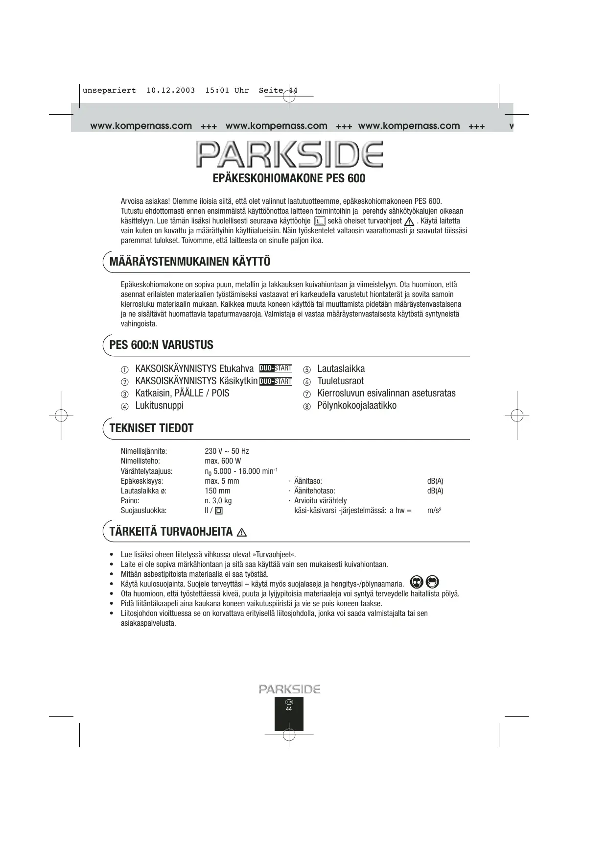 KÄYTTÖOHJE KH 3120 RANDOM ORBITAL SANDER PARKSIDE