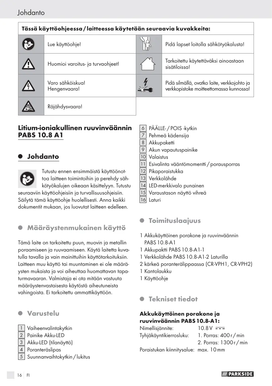 Johdanto Määräystenmukainen käytô. 16 Varustelu… lé Toimituslaajuus 16 Tekniset tiedoi 16 Sähkôtyôkaluja koskevat yleiset turvaohjeet 1. Tyépaikkaturvallisuus. 17 2. Sähkôturvallisuus 18 3. Henkilôiden turvallisuus. 18 4. Sähkätyäkalujen huolellinen käsittely ja käyttS . Sivu 18 5. Akkutyôkalun käytté ja käsittely ivu 19 Akkukäyttôisen porakoneen turvachjeet . .Sivu 19