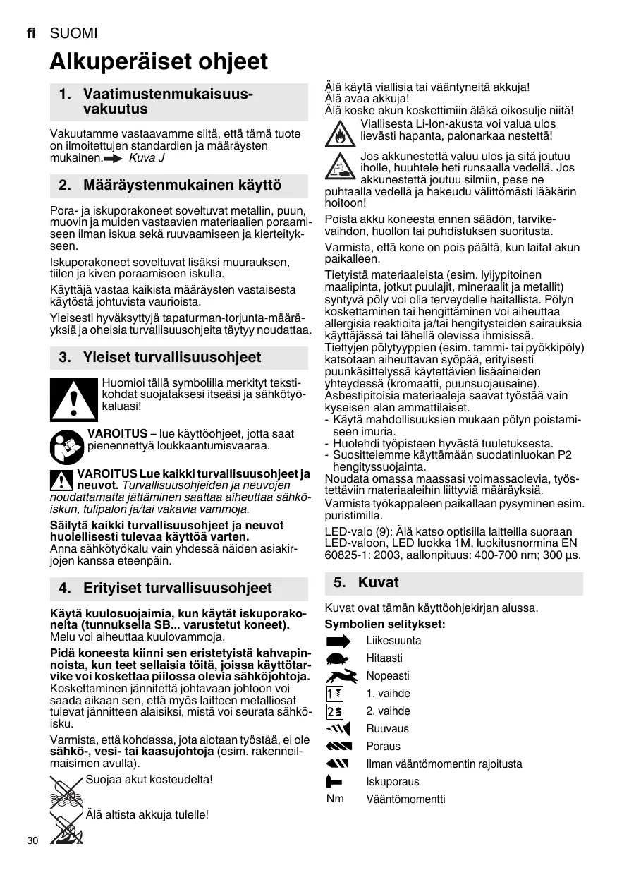 5. Kuvat Kuvat ovat tämän käyttöohjekirjan alussa. Symbolien selitykset: Liikesuunta Hitaasti Nopeasti 1. vaihde 2. vaihde Ruuvaus Poraus Ilman vääntömomentin rajoitusta Iskuporaus Nm