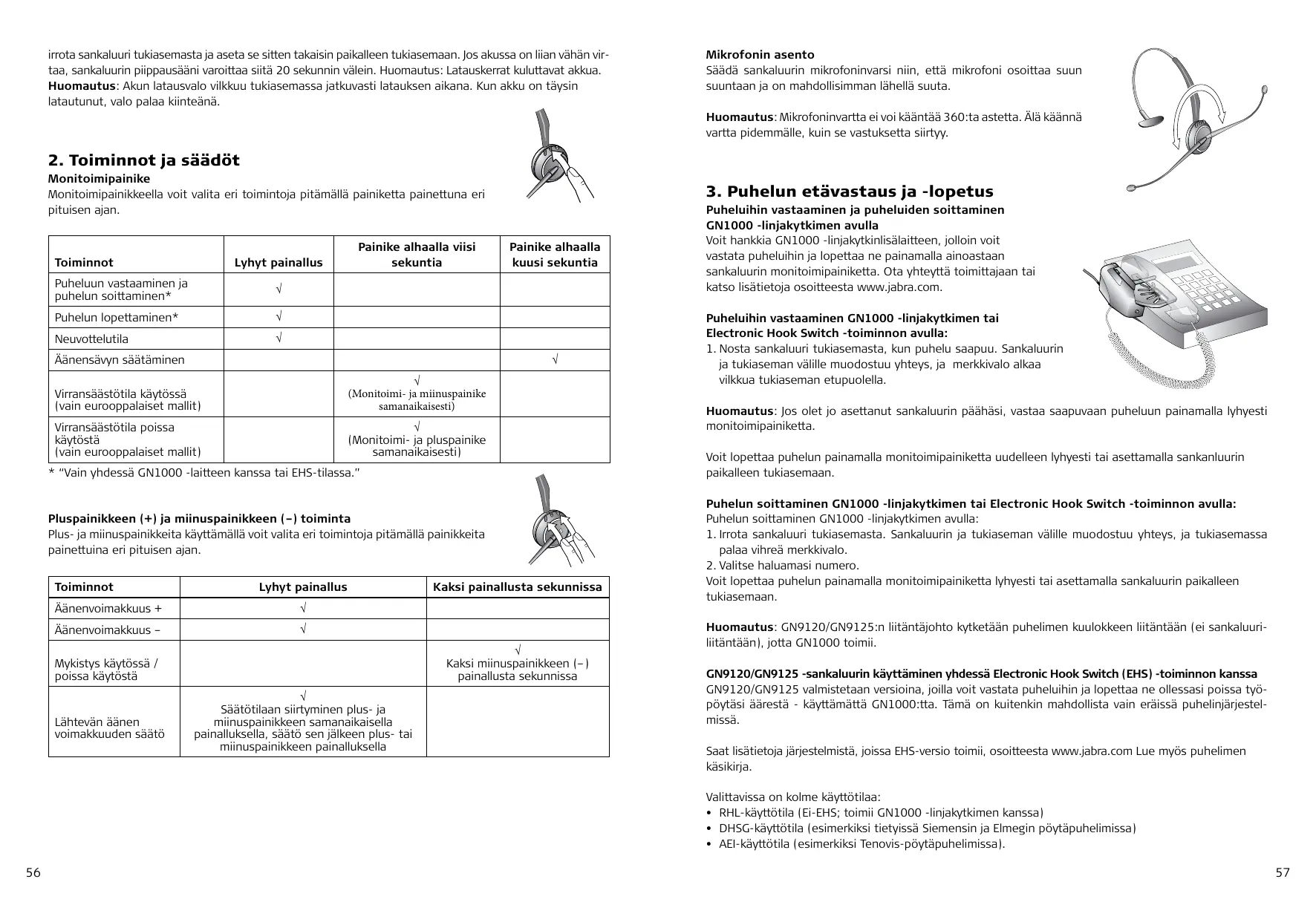 Puheluihin vastaaminen ja puheluiden soittaminen GN1000 -linjakytkimen avulla Voit hankkia GN1000 -linjakytkinlisälaitteen, jolloin voit vastata puheluihin ja lopettaa ne painamalla ainoastaan sankaluurin monitoimipainiketta. Ota yhteyttä toimittajaan tai katso lisätietoja osoitteesta www.jabra.com. Puheluihin vastaaminen GN1000 -linjakytkimen tai Electronic Hook Switch -toiminnon avulla: 1. Nosta sankaluuri tukiasemasta, kun puhelu saapuu. Sankaluurin ja tukiaseman välille muodostuu yhteys, ja merkkivalo alkaa vilkkua tukiaseman etupuolella. Huomautus: Jos olet jo asettanut sankaluurin päähäsi, vastaa saapuvaan puheluun painamalla lyhyesti monitoimipainiketta. Voit lopettaa puhelun painamalla monitoimipainiketta uudelleen lyhyesti tai asettamalla sankanluurin paikalleen tukiasemaan. Puhelun soittaminen GN1000 -linjakytkimen tai Electronic Hook Switch -toiminnon avulla: Puhelun soittaminen GN1000 -linjakytkimen avulla: 1. Irrota sankaluuri tukiasemasta. Sankaluurin ja tukiaseman välille muodostuu yhteys, ja tukiasemassa palaa vihreä merkkivalo. 2. Valitse haluamasi numero. Voit lopettaa puhelun painamalla monitoimipainiketta lyhyesti tai asettamalla sankaluurin paikalleen tukiasemaan. Huomautus: GN9120/GN9125:n liitäntäjohto kytketään puhelimen kuulokkeen liitäntään (ei sankaluuriliitäntään), jotta GN1000 toimii. GN9120/GN9125 -sankaluurin käyttäminen yhdessä Electronic Hook Switch (EHS) -toiminnon kanssa GN9120/GN9125 valmistetaan versioina, joilla voit vastata puheluihin ja lopettaa ne ollessasi poissa työpöytäsi äärestä - käyttämättä GN1000:tta. Tämä on kuitenkin mahdollista vain eräissä puhelinjärjestelmissä. Saat lisätietoja järjestelmistä, joissa EHS-versio toimii, osoitteesta www.jabra.com Lue myös puhelimen käsikirja. Valittavissa on kolme käyttötilaa: • RHL-käyttötila (Ei-EHS; toimii GN1000 -linjakytkimen kanssa) • DHSG-käyttötila (esimerkiksi tietyissä Siemensin ja Elmegin pöytäpuhelimissa) • AEI-käyttötila (esimerkiksi Tenovis-pöytäpuhelimissa).
