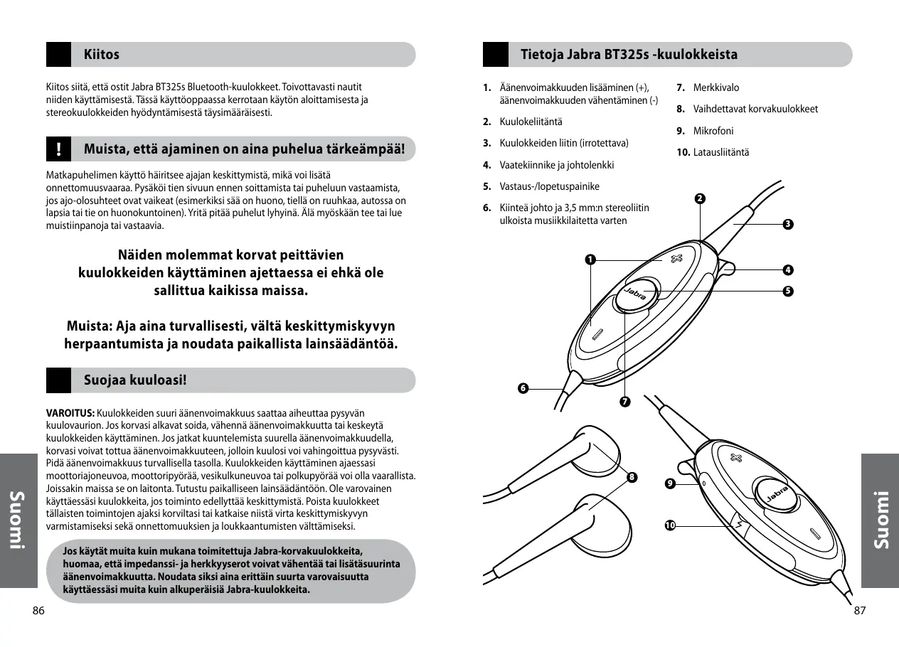 Kiitos siitä, että ostit Jabra BT325s Bluetooth-kuulokkeet. Toivottavasti nautit niiden käyttämisestä. Tässä käyttöoppaassa kerrotaan käytön aloittamisesta ja stereokuulokkeiden hyödyntämisestä täysimääräisesti.