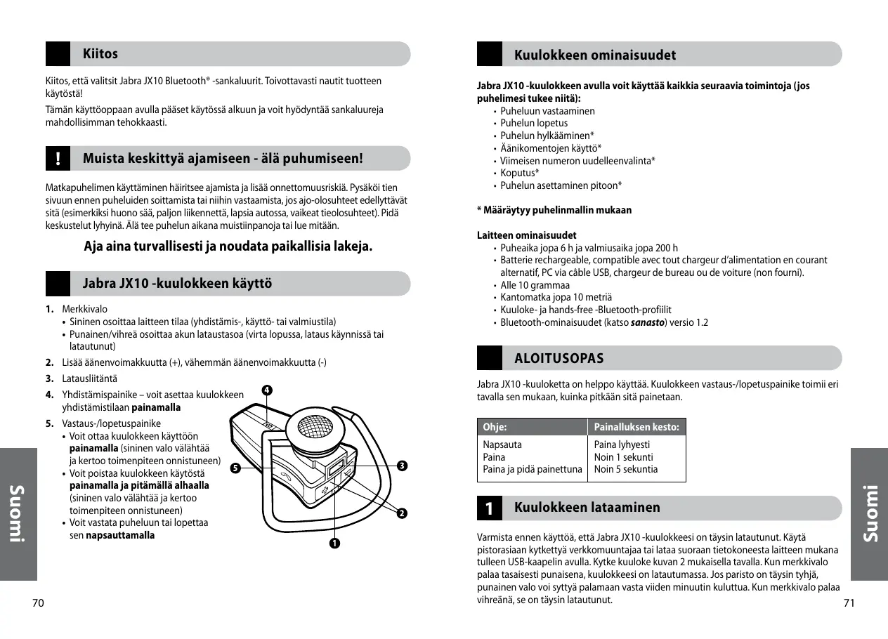 Kiitos, että valitsit Jabra JX10 Bluetooth® -sankaluurit. Toivottavasti nautit tuotteen käytöstä! Tämän käyttöoppaan avulla pääset käytössä alkuun ja voit hyödyntää sankaluureja mahdollisimman tehokkaasti.