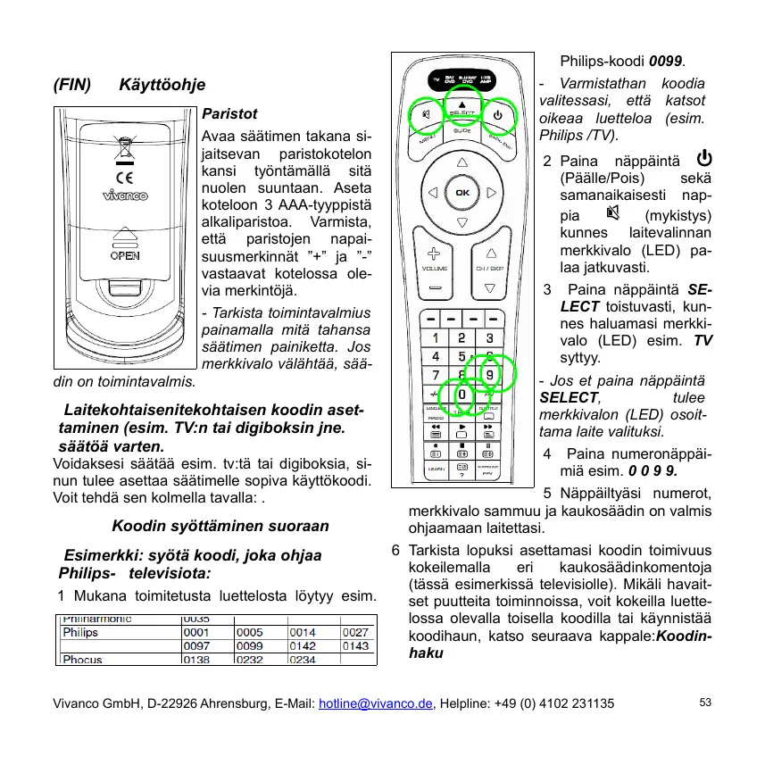 (FIN) Käyttöohje Paristot Avaa säätimen takana sijaitsevan paristokotelon kansi työntämällä sitä nuolen suuntaan. Aseta koteloon 3 AAA-tyyppistä alkaliparistoa. Varmista, että paristojen napaisuusmerkinnät ”+” ja ”-” vastaavat kotelossa olevia merkintöjä. - Tarkista toimintavalmius painamalla mitä tahansa säätimen painiketta. Jos merkkivalo välähtää, sää- din on toimintavalmis. Laitekohtaisenitekohtaisen koodin asettaminen (esim. TV:n tai digiboksin jne. säätöä varten. Voidaksesi säätää esim. tv:tä tai digiboksia, sinun tulee asettaa säätimelle sopiva käyttökoodi. Voit tehdä sen kolmella tavalla: . Philips-koodi 0099. - Varmistathan koodia valitessasi, että katsot oikeaa luetteloa (esim. Philips /TV). 2 Paina näppäintä (Päälle/Pois) sekä samanaikaisesti nappia (mykistys) kunnes laitevalinnan merkkivalo (LED) palaa jatkuvasti. 3 Paina näppäintä SELECT toistuvasti, kunnes haluamasi merkkivalo (LED) esim. TV syttyy. - Jos et paina näppäintä SELECT, tulee merkkivalon (LED) osoittama laite valituksi. 4 Paina numeronäppäimiä esim. 0 0 9 9. 5 Näppäiltyäsi numerot, merkkivalo sammuu ja kaukosäädin on valmis Koodin syöttäminen suoraan ohjaamaan laitettasi. Tarkista lopuksi asettamasi koodin toimivuus Esimerkki: syötä koodi, joka ohjaa kokeilemalla eri kaukosäädinkomentoja Philips- televisiota: (tässä esimerkissä televisiolle). Mikäli havait1 Mukana toimitetusta luettelosta löytyy esim. set puutteita toiminnoissa, voit kokeilla luettelossa olevalla toisella koodilla tai käynnistää koodihaun, katso seuraava kappale:Koodinhaku Vivanco GmbH, D-22926 Ahrensburg, E-Mail: hotline@vivanco.de, Helpline: +49 (0) 4102 231135