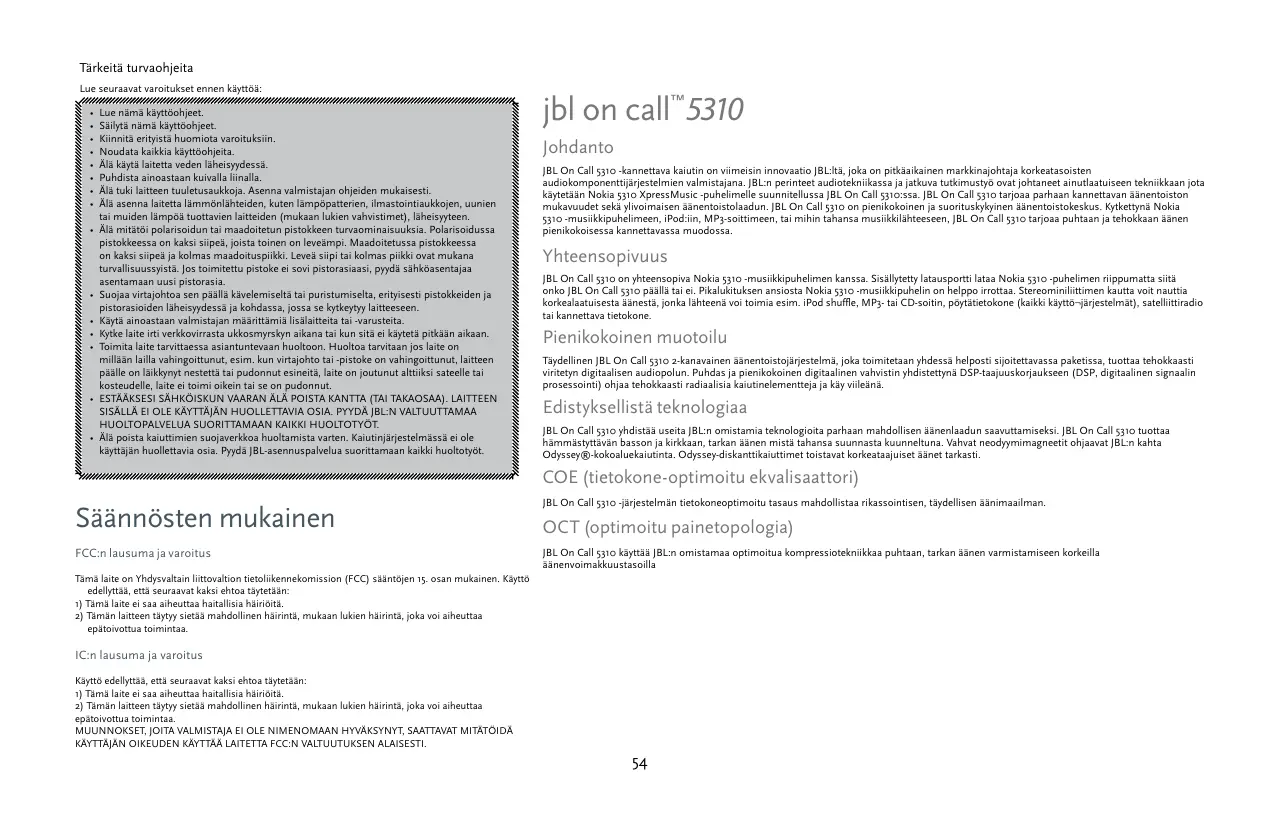 Lue nämä käyttöohjeet. Säilytä nämä käyttöohjeet. Kiinnitä erityistä huomiota varoituksiin. Noudata kaikkia käyttöohjeita. Älä käytä laitetta veden läheisyydessä. Puhdista ainoastaan kuivalla liinalla. Älä tuki laitteen tuuletusaukkoja. Asenna valmistajan ohjeiden mukaisesti. Älä asenna laitetta lämmönlähteiden, kuten lämpöpatterien, ilmastointiaukkojen, uunien tai muiden lämpöä tuottavien laitteiden (mukaan lukien vahvistimet), läheisyyteen. Älä mitätöi polarisoidun tai maadoitetun pistokkeen turvaominaisuuksia. Polarisoidussa pistokkeessa on kaksi siipeä, joista toinen on leveämpi. Maadoitetussa pistokkeessa on kaksi siipeä ja kolmas maadoituspiikki. Leveä siipi tai kolmas piikki ovat mukana turvallisuussyistä. Jos toimitettu pistoke ei sovi pistorasiaasi, pyydä sähköasentajaa asentamaan uusi pistorasia. Suojaa virtajohtoa sen päällä kävelemiseltä tai puristumiselta, erityisesti pistokkeiden ja pistorasioiden läheisyydessä ja kohdassa, jossa se kytkeytyy laitteeseen. Käytä ainoastaan valmistajan määrittämiä lisälaitteita tai -varusteita. Kytke laite irti verkkovirrasta ukkosmyrskyn aikana tai kun sitä ei käytetä pitkään aikaan. Toimita laite tarvittaessa asiantuntevaan huoltoon. Huoltoa tarvitaan jos laite on millään lailla vahingoittunut, esim. kun virtajohto tai -pistoke on vahingoittunut, laitteen päälle on läikkynyt nestettä tai pudonnut esineitä, laite on joutunut alttiiksi sateelle tai kosteudelle, laite ei toimi oikein tai se on pudonnut. ESTÄÄKSESI SÄHKÖISKUN VAARAN ÄLÄ POISTA KANTTA (TAI TAKAOSAA). LAITTEEN SISÄLLÄ EI OLE KÄYTTÄJÄN HUOLLETTAVIA OSIA. PYYDÄ JBL:N VALTUUTTAMAA HUOLTOPALVELUA SUORITTAMAAN KAIKKI HUOLTOTYÖT. Älä poista kaiuttimien suojaverkkoa huoltamista varten. Kaiutinjärjestelmässä ei ole käyttäjän huollettavia osia. Pyydä JBL-asennuspalvelua suorittamaan kaikki huoltotyöt. jbl on call™5310 Johdanto JBL On Call 5310 -kannettava kaiutin on viimeisin innovaatio JBL:ltä, joka on pitkäaikainen markkinajohtaja korkeatasoisten audiokomponenttijärjestelmien valmistajana. JBL:n perinteet audiotekniikassa ja jatkuva tutkimustyö ovat johtaneet ainutlaatuiseen tekniikkaan jota käytetään Nokia 5310 XpressMusic -puhelimelle suunnitellussa JBL On Call 5310:ssa. JBL On Call 5310 tarjoaa parhaan kannettavan äänentoiston mukavuudet sekä ylivoimaisen äänentoistolaadun. JBL On Call 5310 on pienikokoinen ja suorituskykyinen äänentoistokeskus. Kytkettynä Nokia 5310 -musiikkipuhelimeen, iPod:iin, MP3-soittimeen, tai mihin tahansa musiikkilähteeseen, JBL On Call 5310 tarjoaa puhtaan ja tehokkaan äänen pienikokoisessa kannettavassa muodossa. Yhteensopivuus JBL On Call 5310 on yhteensopiva Nokia 5310 -musiikkipuhelimen kanssa. Sisällytetty latausportti lataa Nokia 5310 -puhelimen riippumatta siitä onko JBL On Call 5310 päällä tai ei. Pikalukituksen ansiosta Nokia 5310 -musiikkipuhelin on helppo irrottaa. Stereominiliittimen kautta voit nauttia korkealaatuisesta äänestä, jonka lähteenä voi toimia esim. iPod shuffle, MP3- tai CD-soitin, pöytätietokone (kaikki käyttö¬järjestelmät), satelliittiradio tai kannettava tietokone. Pienikokoinen muotoilu Täydellinen JBL On Call 5310 2-kanavainen äänentoistojärjestelmä, joka toimitetaan yhdessä helposti sijoitettavassa paketissa, tuottaa tehokkaasti viritetyn digitaalisen audiopolun. Puhdas ja pienikokoinen digitaalinen vahvistin yhdistettynä DSP-taajuuskorjaukseen (DSP, digitaalinen signaalin prosessointi) ohjaa tehokkaasti radiaalisia kaiutinelementteja ja käy viileänä. Edistyksellistä teknologiaa JBL On Call 5310 yhdistää useita JBL:n omistamia teknologioita parhaan mahdollisen äänenlaadun saavuttamiseksi. JBL On Call 5310 tuottaa hämmästyttävän basson ja kirkkaan, tarkan äänen mistä tahansa suunnasta kuunneltuna. Vahvat neodyymimagneetit ohjaavat JBL:n kahta Odyssey®-kokoaluekaiutinta. Odyssey-diskanttikaiuttimet toistavat korkeataajuiset äänet tarkasti. COE (tietokone-optimoitu ekvalisaattori) Säännösten mukainen JBL On Call 5310 -järjestelmän tietokoneoptimoitu tasaus mahdollistaa rikassointisen, täydellisen äänimaailman. FCC:n lausuma ja varoitus JBL On Call 5310 käyttää JBL:n omistamaa optimoitua kompressiotekniikkaa puhtaan, tarkan äänen varmistamiseen korkeilla äänenvoimakkuustasoilla OCT (optimoitu painetopologia) Tämä laite on Yhdysvaltain liittovaltion tietoliikennekomission (FCC) sääntöjen 15. osan mukainen. Käyttö edellyttää, että seuraavat kaksi ehtoa täytetään: