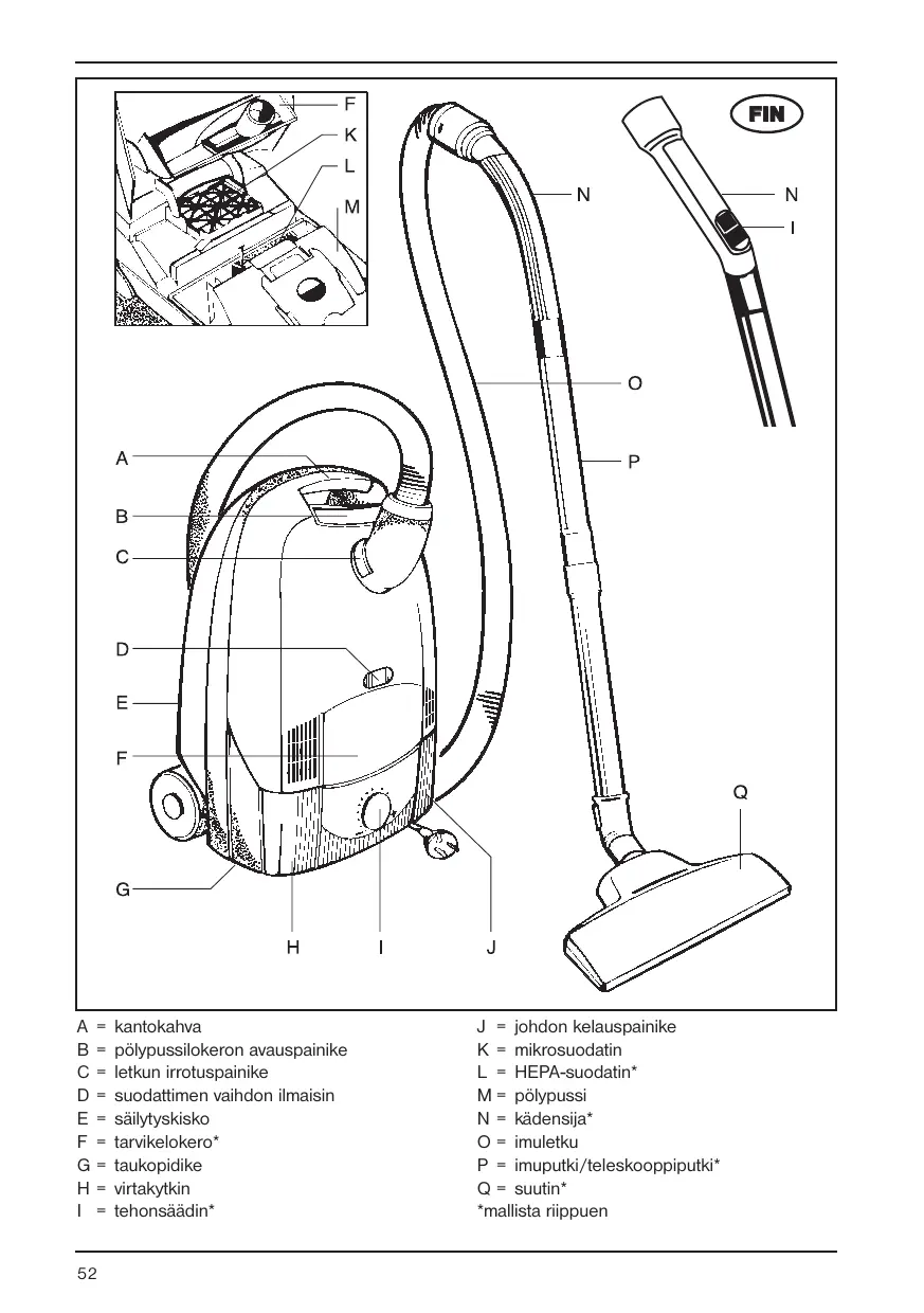 Puhdistus Pyyhi imurin runko ja polypussen lokero tarvitta-essa kostealla liinalla ja kuivaa. Alä kayta han-kausaineita tai liuottomia. Puhdista lattiasuutin aika ajoin rakosuuttimella.