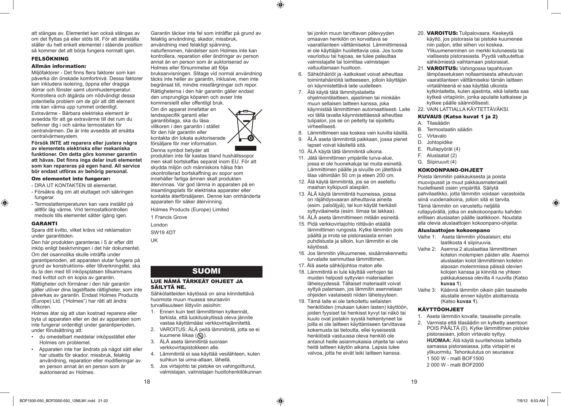 SW19 4DT UK SUOMI LUE NÄMÄ TÄRKEÄT OHJEET JA SÄILYTÄ NE. Sähkölaitteiden käytössä on aina kiinnitettävä huomiota muun muassa seuraaviin turvallisuuteen liittyviin asioihin: 1. Ennen kuin teet lämmittimen kytkennät, tarkista, että luokituskyltissä oleva jännite vastaa käyttämääsi verkkovirtajännitettä. 2. VAROITUS: ÄLÄ peitä lämmitintä, jotta se ei kuumene liikaa ( ). 3. ÄLÄ aseta lämmitintä suoraan verkkovirtapistokkeen alle. 4. Lämmitintä ei saa käyttää vesilähteen, kuten suihkun tai uima-altaan, lähellä. 5. Jos virtajohto tai pistoke on vahingoittunut, valmistajan, valmistajan huoltohenkilökunnan