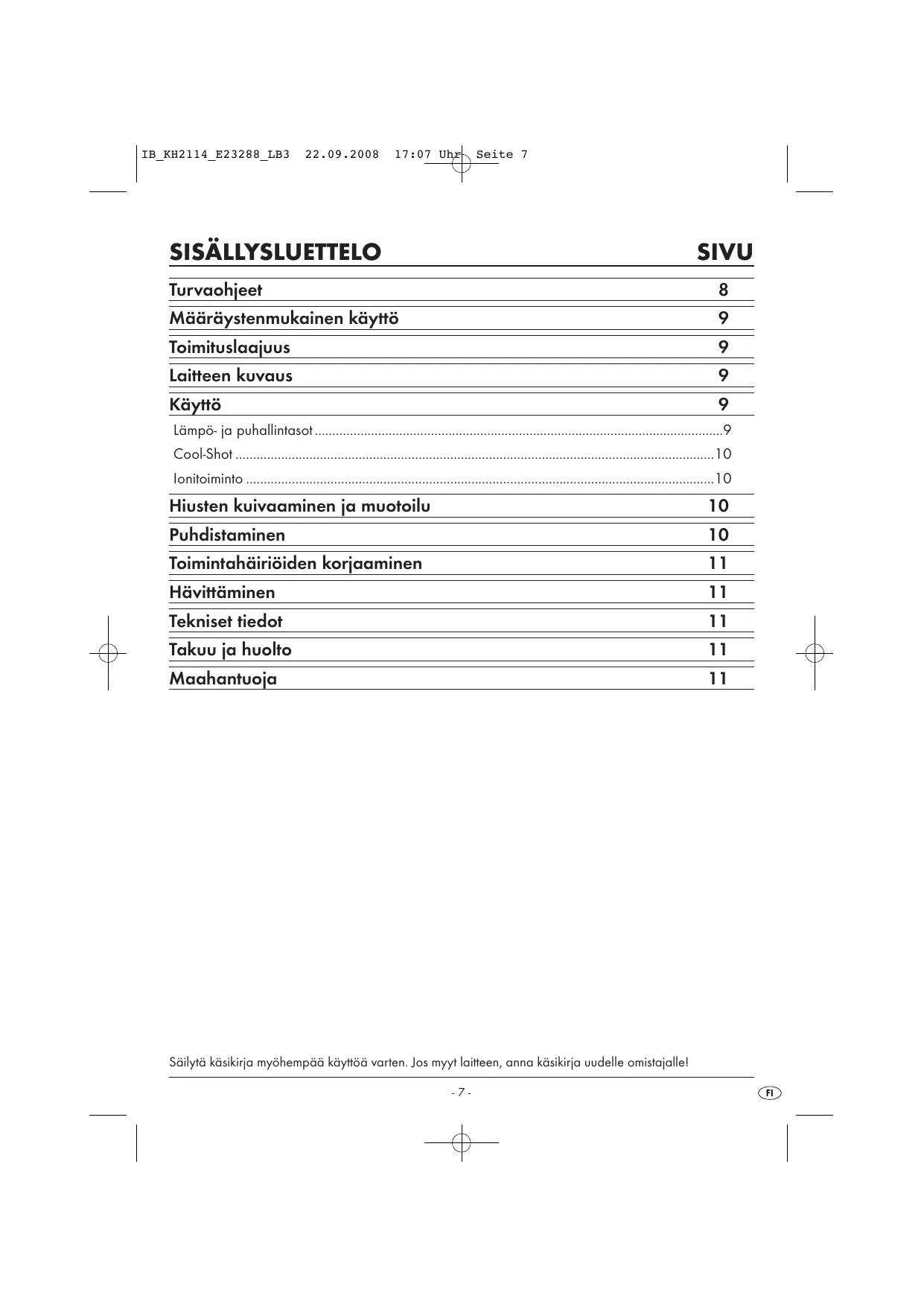 Turvachijeet Määräystenmukainen käyttô 9 Toimituslaajuus 9 Laitteen kuvaus 9 KäyttS 9 Lämpé- ja puhallintasot … Cool-Shot lonitoiminto … Hiusten kuivaaminen ja muotoilu 10 Puhdistaminen 10 Toimintahäirisiden korjaaminen 11 Hävittäminen 11 Tekniset tiedot 11 Takuu ja huolto 11 Maahantuoja 11 Säilytä käsikirja myôhempää käyitôë varten. Jos my laitteen, anna käsikira uudelle omistajallel