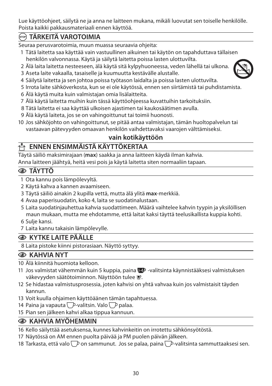 1 _ENNEN ENSIMMAÂISTA KÂYTTÜKERTAA Täytà säiliô maksimirajaan (max) saakka ja anna laitteen käydä ilman kahvia. Anna laitteen jäähtyä, heitä vesi pois ja Käytä laitetta siten normaaliin tapaan.