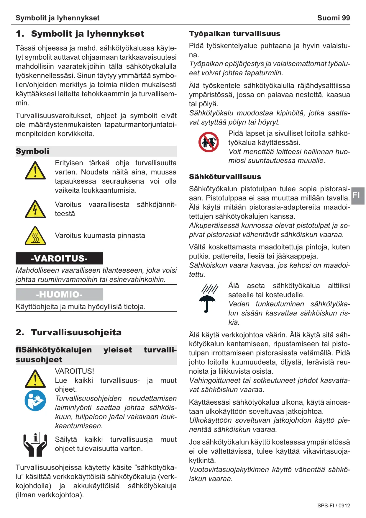 fiSähkötyökalujen suusohjeet yleiset turvalli- VAROITUS! Lue kaikki turvallisuus- ja muut ohjeet. Turvallisuusohjeiden noudattamisen laiminlyönti saattaa johtaa sähköiskuun, tulipaloon ja/tai vakavaan loukkaantumiseen. Säilytä kaikki turvallisuusja ohjeet tulevaisuutta varten. muut Turvallisuusohjeissa käytetty käsite ”sähkötyökalu” käsittää verkkokäyttöisiä sähkötyökaluja (verkkojohdolla) ja akkukäyttöisiä sähkötyökaluja (ilman verkkojohtoa). Älä työskentele sähkötyökalulla räjähdysalttiissa ympäristössä, jossa on palavaa nestettä, kaasua tai pölyä. Sähkötyökalu muodostaa kipinöitä, jotka saattavat sytyttää pölyn tai höyryt. Pidä lapset ja sivulliset loitolla sähkötyökalua käyttäessäsi. Voit menettää laitteesi hallinnan huomiosi suuntautuessa muualle. Sähköturvallisuus Sähkötyökalun pistotulpan tulee sopia pistorasiaan. Pistotulppaa ei saa muuttaa millään tavalla. FI Älä käytä mitään pistorasia-adaptereita maadoitettujen sähkötyökalujen kanssa. Alkuperäisessä kunnossa olevat pistotulpat ja sopivat pistorasiat vähentävät sähköiskun vaaraa. Vältä koskettamasta maadoitettuja pintoja, kuten putkia. pattereita, liesiä tai jääkaappeja. Sähköiskun vaara kasvaa, jos kehosi on maadoitettu. Älä aseta sähkötyökalua alttiiksi sateelle tai kosteudelle. Veden tunkeutuminen sähkötyökalun sisään kasvattaa sähköiskun riskiä. Älä käytä verkkojohtoa väärin. Älä käytä sitä sähkötyökalun kantamiseen, ripustamiseen tai pistotulpan irrottamiseen pistorasiasta vetämällä. Pidä johto loitolla kuumuudesta, öljystä, terävistä reunoista ja liikkuvista osista. Vahingoittuneet tai sotkeutuneet johdot kasvattavat sähköiskun vaaraa. Käyttäessäsi sähkötyökalua ulkona, käytä ainoastaan ulkokäyttöön soveltuvaa jatkojohtoa. Ulkokäyttöön soveltuvan jatkojohdon käyttö pienentää sähköiskun vaaraa. Jos sähkötyökalun käyttö kosteassa ympäristössä ei ole vältettävissä, tulee käyttää vikavirtasuojakytkintä. Vuotovirtasuojakytkimen käyttö vähentää sähköiskun vaaraa. SPS-FI / 0912 100 Suomi Turvallisuusohjeita Henkilöturvallisuus Ole valpas, kiinnitä huomiota työskentelyysi ja noudata tervettä järkeä sähkötyökalua käyttäessäsi. Älä käytä mitään sähkötyökalua, jos olet väsynyt tai huumeiden, alkoholin tahi lääkkeiden vaikutuksen alaisena. Hetken tarkkaamattomuus sähkötyökalua käytettäessä saattaa johtaa vakavaan loukkaantumiseen. Käytä suojavarusteita. Käytä aina suojalaseja. Henkilökohtaisen suojavarustuksen käyttö, kuten pölynaamarin, luistamattomien turvakenkien, suojakypärän tai kuulonsuojaimien, riippuen sähkötyökalun lajista ja käyttötavasta, vähentää loukaantumisriskiä.