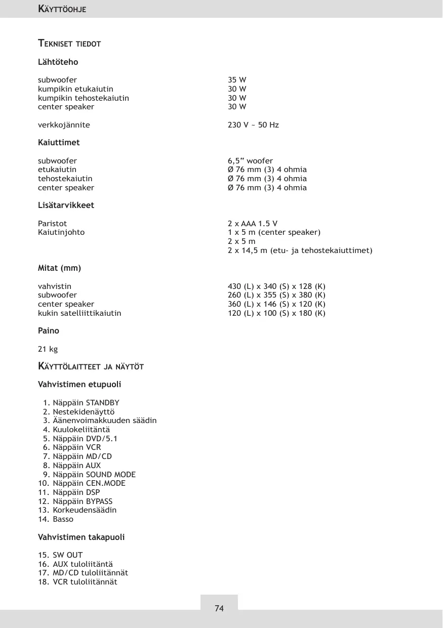 Huomautus: DVD-levyt voivat sisältää katkelmia, joissa on erittäin korkeat äänenvoimakkuuden signaalitasot ja aiheuttaa siten vääristymiä, kun levyjä toistetaan suurimmalla äänenvoimakkuudella. Vähennä äänenvoimakkuutta tällaisten vääristymien ilmaantuessa. Jos käytät kaiuttimia vääristymillä pitempiä aikoja, se voi vahingoittaa kaiuttimet ja/tai vahvistimen. KUULOKEKÄYTTÖ Laita kuulokkeen pistoke (6,3 mm jakkipistoke) vahvistimen etupuolella olevaan kuulokepistorasiaan. Kaiuttimet kytkeytyvät automaattisesti pois päältä. PUHDISTUS Käytä kevyesti kostutettua liinaa ja mietoa astianpesuainetta. Älä käytä kemikaaleja, alkoholia, laimennusainetta tai muita liuotusaineita sisältäviä puhdistusaineita!