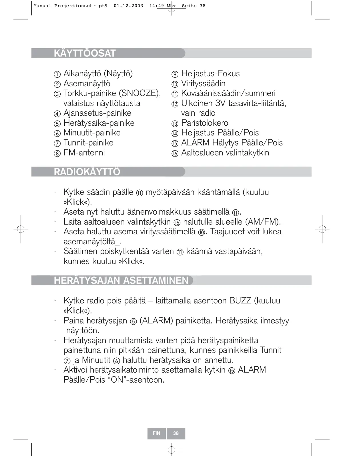 Aikanäyttö (Näyttö) Asemanäyttö Torkku-painike (SNOOZE), valaistus näyttötausta Ajanasetus-painike Herätysaika-painike Minuutit-painike Tunnit-painike FM-antenni