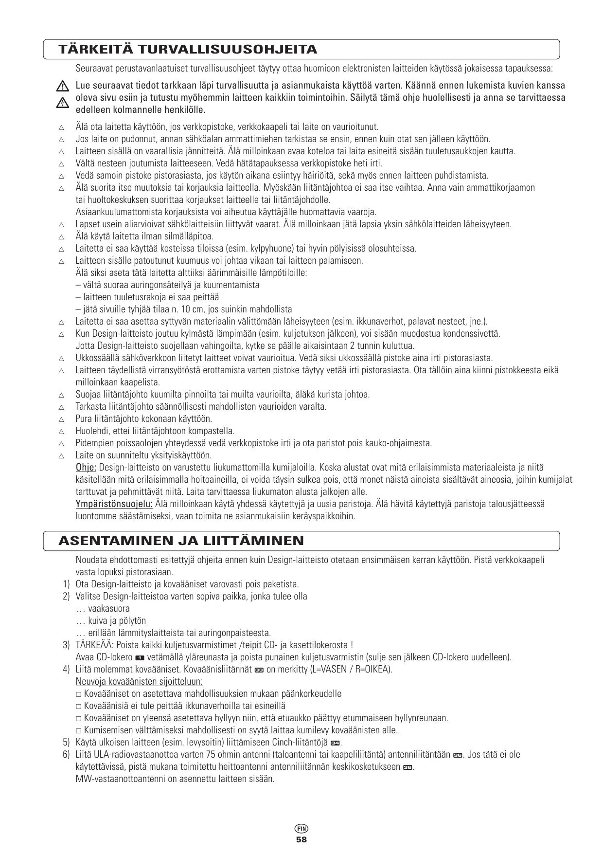Ne pas mettre l'appareil en service si la prise, le cordon ou l'appareil sont endommagés. Si l'appareil est tombé, le faire contrôler au préalable par un électricien spécialisé avant de le remettre en service. L'intérieur de l'appareil est soumis à des tensions dangereuses. Ne jamais ouvrir le boîtier ni introduire des objets par les trous d'aérations. Evitez de faire pénétrer des liquides dans l'appareil. Si nécessaire, débrancher la prise. Débranchez également la prise de la prise murale en cas d'apparition de défauts pendant le fonctionnement de l'appareil et avant de nettoyer l'appareil. Ne procédez vous-même à aucunes modifications ni réparations de l'appareil. De même, ne remplacez pas vous-même le cordon de raccordement. Ne faites procéder à toutes réparations de l'appareil ou du cordon de raccordement que par un atelier spécialisé ou un centre SAV. Toute réparation incorrecte peut être la source de dangers importants pour l'utilisateur. Les enfants sous-estiment souvent les dangers lors de la manipulation d'appareils électriques. Ne laissez donc jamais des enfants à proximité d'appareils électriques sans surveillance. Ne laissez pas l'appareil sans surveillance pendant le fonctionnement. Ne pas utiliser l'appareil dans les lieux humides (par exemple salles de bain) ou soumis à une poussière importante. La chaleur accumulée à l'intérieur de l'appareil peut entraîner une panne ou un incendie. N'exposez donc pas l'appareil à des températures extrêmes: – éviter les rayons directs du soleil et la chaleur du chauffage – ne pas boucher ou recouvrir les fentes d'aération de l'appareil – dans la mesure du possible, laisser 10 cm de libre par rapport aux côtés de l'appareil Ne pas installer l'appareil à proximité immédiate de matériaux inflammables (par exemple rideaux, liquides inflammables etc...). Si la chaîne est transportée d'un lieu froid dans un lieu chaud (par exemple après le transport), il peut se former une condensation à l'intérieur. Pour ne pas endommager la chaîne, attendre au moins 2 heures avant de la mettre en marche. Lors d'un orage, les appareils raccordés au secteur peuvent être endommagés. En cas d'orage, débranchez donc la prise de la prise murale et débranchez également la prise de l'antenne. Pour que l'appareil soit coupé complètement de l'alimentation électrique, il faut absolument débrancher la prise de la prise murale. Ce faisant, saisir la prise et jamais le cordon. Protégez le cordon de raccordement de tout contact avec des surfaces chaudes et de tous autres endommagements et veillez à ne pas le coincer. Contrôlez régulièrement le cordon de raccordement en vue de détecter d'éventuels endommagements. Lors de l'utilisation, déroulez complètement le cordon. Veillez à ce qu'il ne soit pas possible de trébucher sur le cordon de raccordement. En cas d'absence prolongée, débrancher la prise et retirer les piles de la télécommande. L'appareil est conçu pour un usage domestique. Avis: La chaîne est équipée de pieds en caoutchouc antidérapants. Etant donné que les sols peuvent être constitués des matériaux les plus divers et traités avec les produits d'entretien les plus divers, il ne peut être entièrement exclu que certaines de ces substances contiennent des composants susceptibles d'attaquer et de ramollir les pieds en caoutchouc. Le cas échéant, posez un support antidérapant sous les pieds. Protection de l'environnement: Ne jamais mélanger des piles usagées et des piles neuves. Dans l'intérêt de notre environnement, n'éliminez pas les piles usagées dans les ordures ménagères, mais remettez-les à des centres de collecte correspondants.
