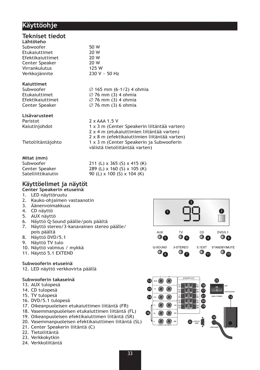 2. Enchez la che secteur du subwoofer dans une prise de courant murale et placez l’interrupteur principal sur ON (marche). La LED POWER ON/STANDBY (secteur marche/état d’attente) sur la face avant du haut-parleur centrale s’allume alors trois fois et reste ensuite allumée. Appuyez sur la touche STANDBY (état d’attente) du haut-parleur central. La LED DVD/5.1 du haut-parleur central s’allume. 3. Sélectionnez l’entrée de signaux correspondante au moyen de la télécommande. DVD/5.1 est sélectionné de manière standard. 4. Réglez le téléviseur sur volume sonore minimal. 5. Mettez la source de signaux souhaitée (lecteur de DVD, magnétoscope, etc…) en circuit. 6. Introduisez le support à reproduire (DVD, cassette vidéo, etc...) et démarrez la lecture. 7. Réglez ensuite le subwoofer, les haut-parleurs avant, les haut-parleurs d’effet et le hautparleur central au moyen de la télécommande de –9 (minimum) jusqu’à 9 (maximum). Le niveau du volume sonore correspondant est afché. 8. Réglez les aiguës et les graves selon vos souhaits de 1-5. 9. Ajustez la balance gauche et droite en appuyant sur les touches correspondantes de 00-15 si nécessaire. L’afchage LED indique 00 lorsque la balance est réglée exactement au milieu. 10. Appuyez sur RESET pour remettre le Surround Sound System aux réglages départ usine (volume sonore principal modéré, graves et aiguës). 11. Après avoir sélectionné les sources pour le signal audio TV/CD/AUX et démarré la reproduction, vous pouvez d’abord entendre un effet sonore surround simulé en appuyant sur la touche 5.1 EXTEND/Q-Sound. En actionnant la touche Stéréo/3 canaux stéréo, vous obtenez l’effet sonore 3 canaux stéréo. Pour retourner au mode stéréo normal, appuyez sur la touche Stéréo/3 canaux stéréo jusqu’à ce que l’indicateur s’éteigne. Remarque : les fonctions Q-SOUND et 3 canaux stéréo ne sont pas activées lorsque 5.1 EXTEND n’est pas encore sur ON (marche). 12. Appuyez sur MUTE (arrêt du son) lorsque vous désirez arrêter le son. L’indicateur STANDBY/ MUTE passe au rouge. Appuyez une deuxième fois sur la touche pour retourner au mode normal.