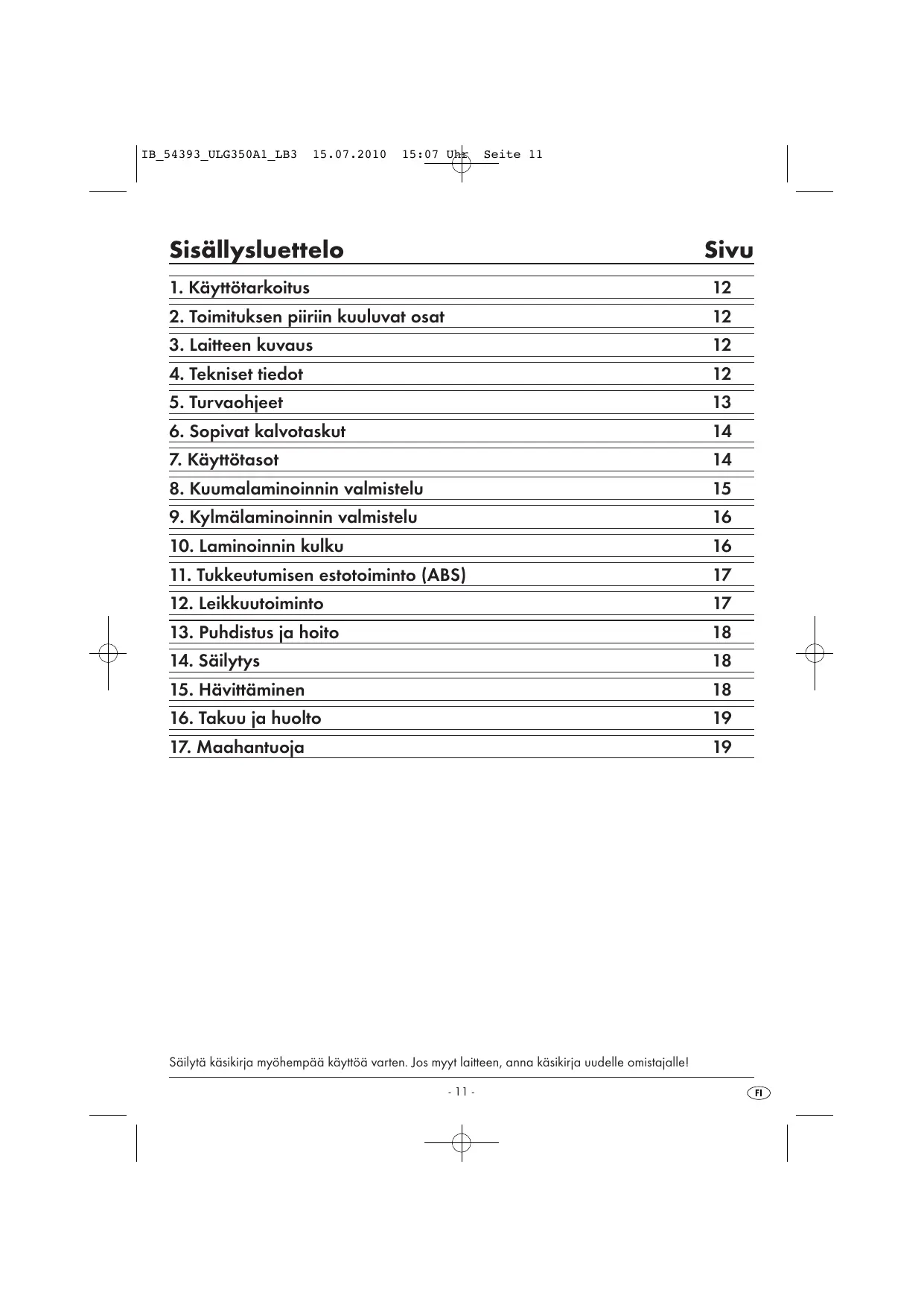 11. Tukkeutumisen estotoiminto (ABS) 17