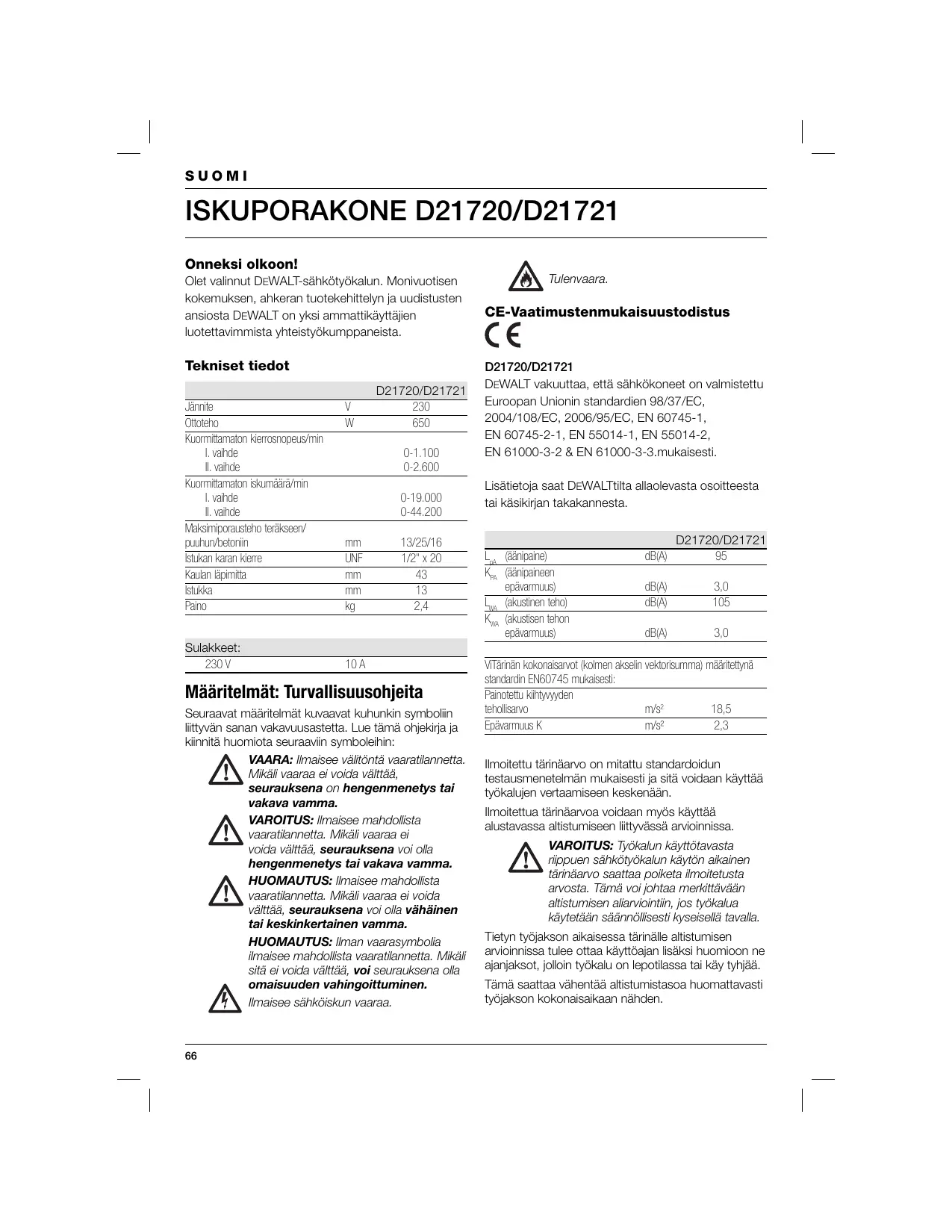 Tulenvaara. CE-Vaatimustenmukaisuustodistus D21720/D21721 DEWALT vakuuttaa, että sähkökoneet on valmistettu Euroopan Unionin standardien 98/37/EC, 2004/108/EC, 2006/95/EC, EN 60745-1, EN 60745-2-1, EN 55014-1, EN 55014-2, EN 61000-3-2 & EN 61000-3-3.mukaisesti. Lisätietoja saat DEWALTtilta allaolevasta osoitteesta tai käsikirjan takakannesta. LpA (äänipaine) KPA (äänipaineen epävarmuus) LWA (akustinen teho) KWA (akustisen tehon epävarmuus) dB(A) D21720/D21721