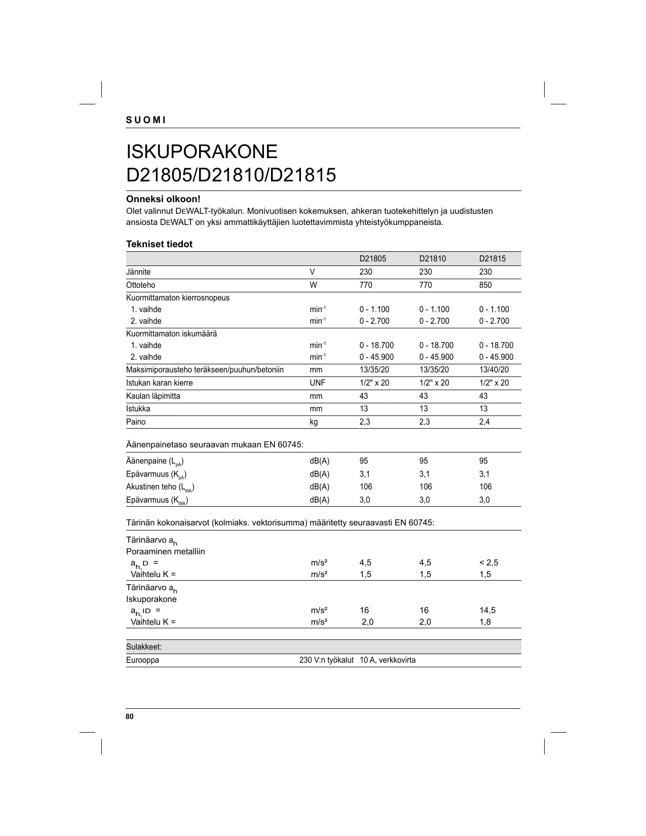 SUOMI ISKUPORAKONE D21805/D21810/D21815 Onneksi olkoon! Olet valinnut DEWALT-työkalun. Monivuotisen kokemuksen, ahkeran tuotekehittelyn ja uudistusten ansiosta DEWALT on yksi ammattikäyttäjien luotettavimmista yhteistyökumppaneista. Tekniset tiedot D21805 D21810 D21815 Jännite