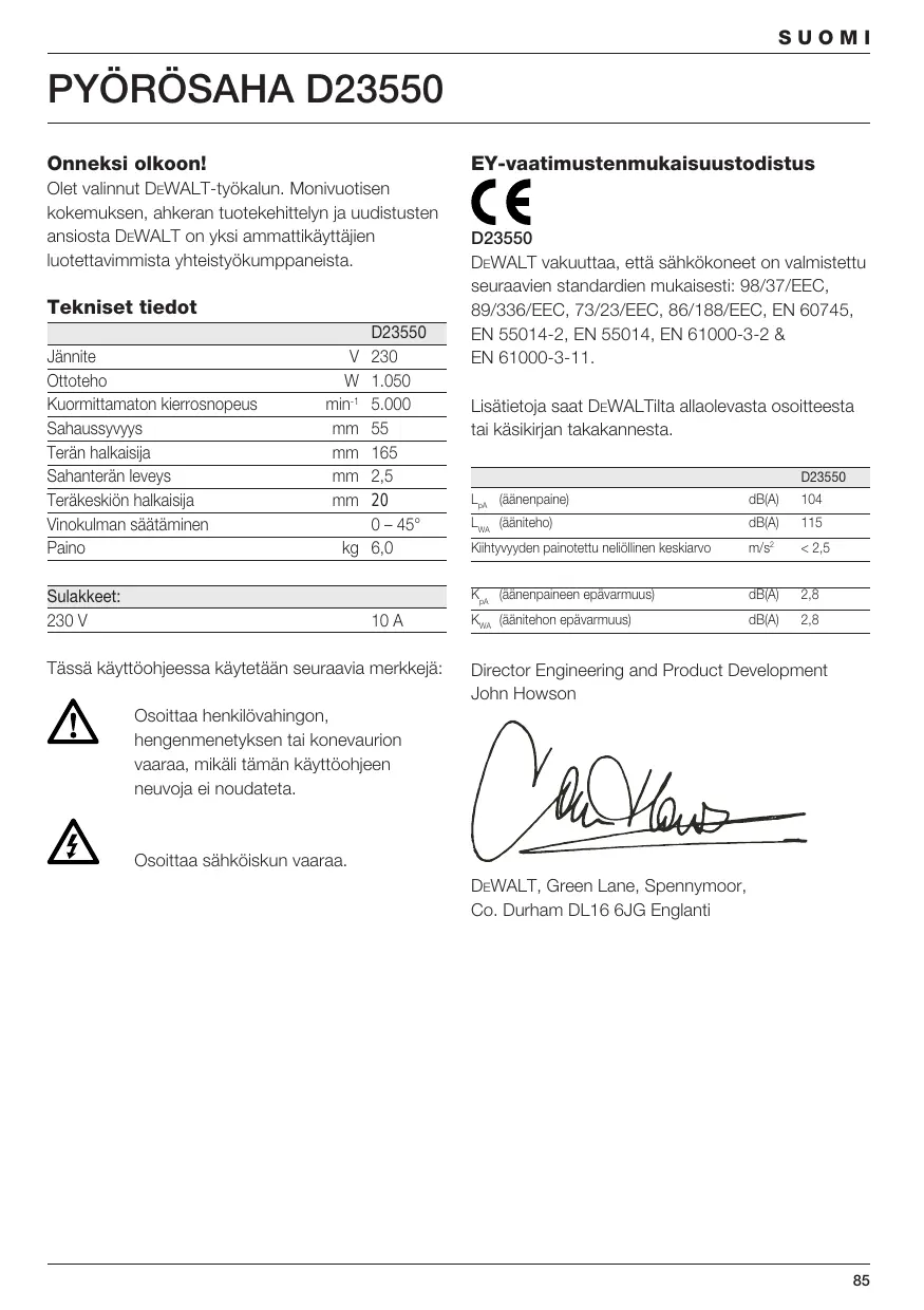 Sulakkeet: 230 V 10 A Tässä käyttöohjeessa käytetään seuraavia merkkejä: D23550 DEWALT vakuuttaa, että sähkökoneet on valmistettu seuraavien standardien mukaisesti: 98/37/EEC, 89/336/EEC, 73/23/EEC, 86/188/EEC, EN 60745, EN 55014-2, EN 55014, EN 61000-3-2 & EN 61000-3-11. Lisätietoja saat DEWALTilta allaolevasta osoitteesta tai käsikirjan takakannesta. D23550 LpA (äänenpaine) dB(A)