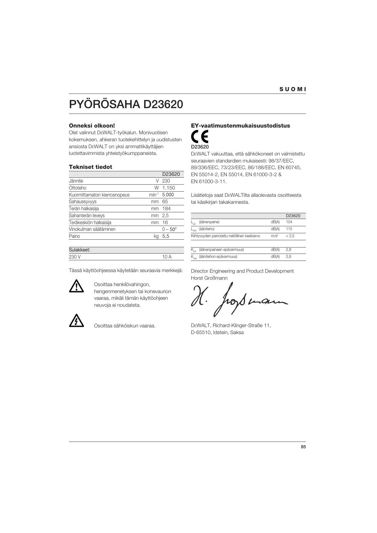 Sulakkeet: 230 V 10 A Tässä käyttöohjeessa käytetään seuraavia merkkejä: D23620 DEWALT vakuuttaa, että sähkökoneet on valmistettu seuraavien standardien mukaisesti: 98/37/EEC, 89/336/EEC, 73/23/EEC, 86/188/EEC, EN 60745, EN 55014-2, EN 55014, EN 61000-3-2 & EN 61000-3-11. Lisätietoja saat DEWALTilta allaolevasta osoitteesta tai käsikirjan takakannesta. D23620 LpA (äänenpaine) dB(A)