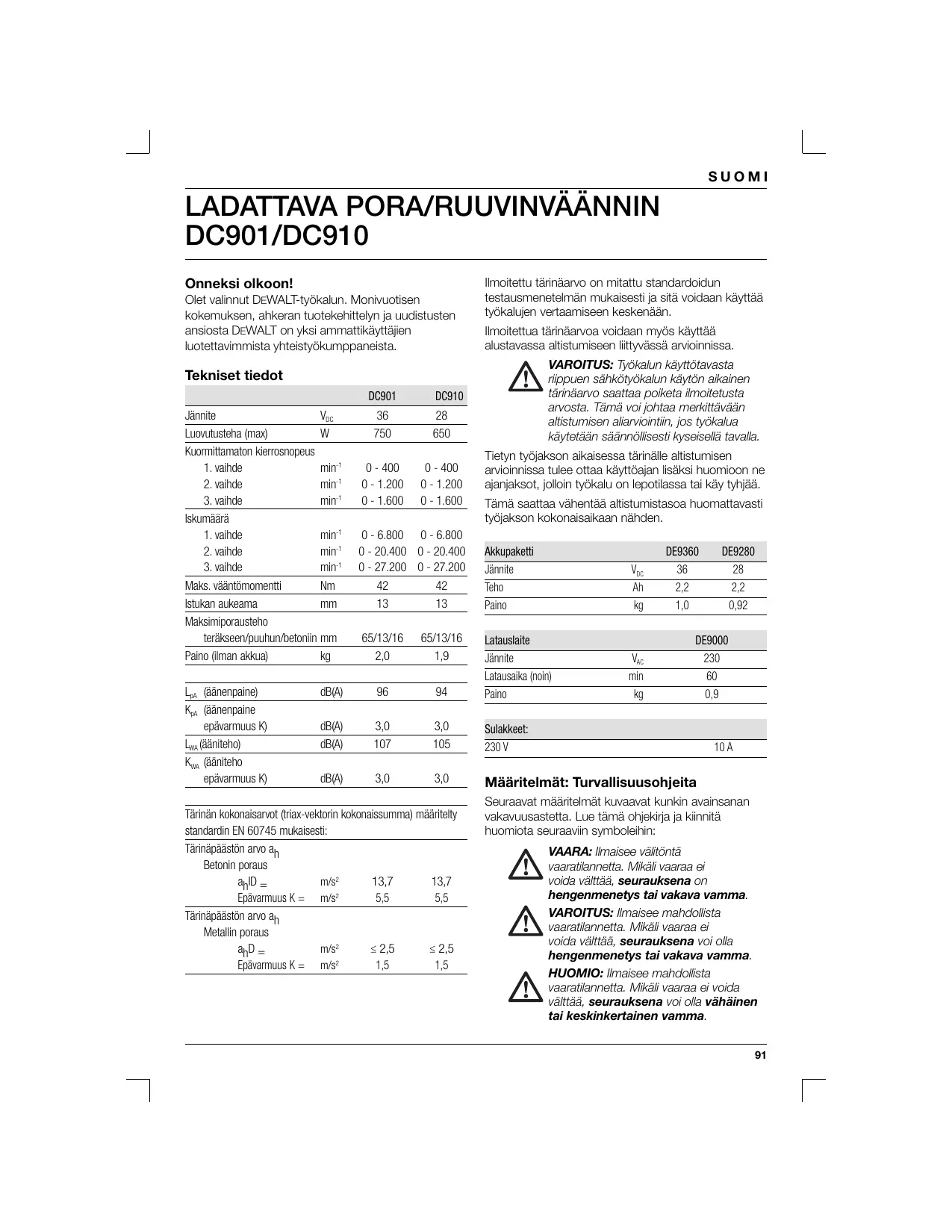 Mk. vääntômomentti Nm 42 42 Istukan aukeama mm 13 13 Maksimiporausteho teräkseen/puuhun/betoniin mm 65/13/16 65/13/16 Paino (iman akkua) mn 20 19 Le (änenpaine) BU 96 ga Ka (Gänenpaine epävarmuus cB{A) 30 30 Liu Gäniteho) BA) 107 105 Ki Géäniteho epävarmuus K) cB{A) 30 30 Tärinän Kokonaïsarvot (riax-vektorin kokonaissumma) mäâitey standardin EN 60745 mukaisest Térinäpééstôn ar a, Betonin poraus anD = ms 137 137 Epévarmuus K = mé 55 55 Tärinépééstôn ano ap Metallin poraus ap = mé <25 <25 Epävarmuus K = mé 15 15 IImoïtettu tärinäarvo on mitattu standardoidun testausmenetelmän mukaisesti ja sitä voidaan käyttää ty6kalujen vertaamiseen keskenään Iimoitettua tärinäarvoa voidaan myès käyttää alustavassa altistumiseen littyvässä arvioinnissa. VAROITUS: Tyôkalun käyttôtavasta VAN rijppuen sähkôtyôkalun käytôn aikainen tärinäarvo saattaa poiketa ilmoitetusta arvosta. Tämä voi johtaa merkittävään altistumisen aliarviointin, jos tyékalua kéytetéän séännôlisesti kyseisell tavall. Tietyn tyôjakson aikalsessa tärinälle aftistumisen arvioinnissa tulee ottaa Käyttôajan lisäksi huomioon ne ajanjaksot, jolloin tyékalu on lepotilassa tai Käy tyhjéä Tämä saattaa vähentää altistumistasoa huomattavasti tyiakson kokonaisaikaan nähden. Akkupaketi DE9360 DE9280 Jinite Ve # 2 To A 22 22 Paino CE 092 Latauslaite DE9000 Jinnie 230 Latausaika (hoin) min 60 Paino Kg 09 Sulakkeet: Z0v T0A Määritelmät: Turvallisuusohjeita Seuraavat määritelmät kuvaavat kunkin avainsanan vakavuusastetta. Lue tämä ohjekija ja Kinnität huomiota seuraavin symboleihin: VAARA: Imaisee välténté VAN vaaratiannetta. Mikäli vaaraa ei void véltéë, seurauksena on hengenmenetys tai vakava vamma. VAROITUS: Imaisee mahdolista vaaratlannetta. Mikäl vaaraa ei voida välttää, seurauksena voi ollà hengenmenetys tai vakava vamma. ( HUOMIO: limaisee mahdolista vaaratilannetta. Mikäli vaaraa ei voi välttää, seurauksena voi olla vähäinen tai keskinkertainen vamma.