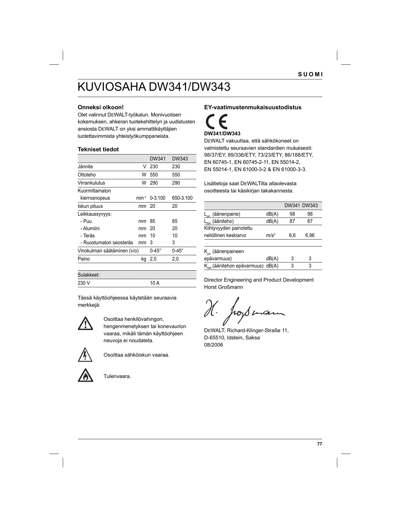 DeWALT vakuuttaa,etta sahkokoneet on valmistetu seuraavien standardien mukaisesti: 98/37/EY, 89/336/ETY, 73/23/ETY, 86/188/ETY, EN 60745-1, EN 60745-2-11, EN 55014-2, EN 55014-1, EN 61000-3-2 & EN 61000-3-3.